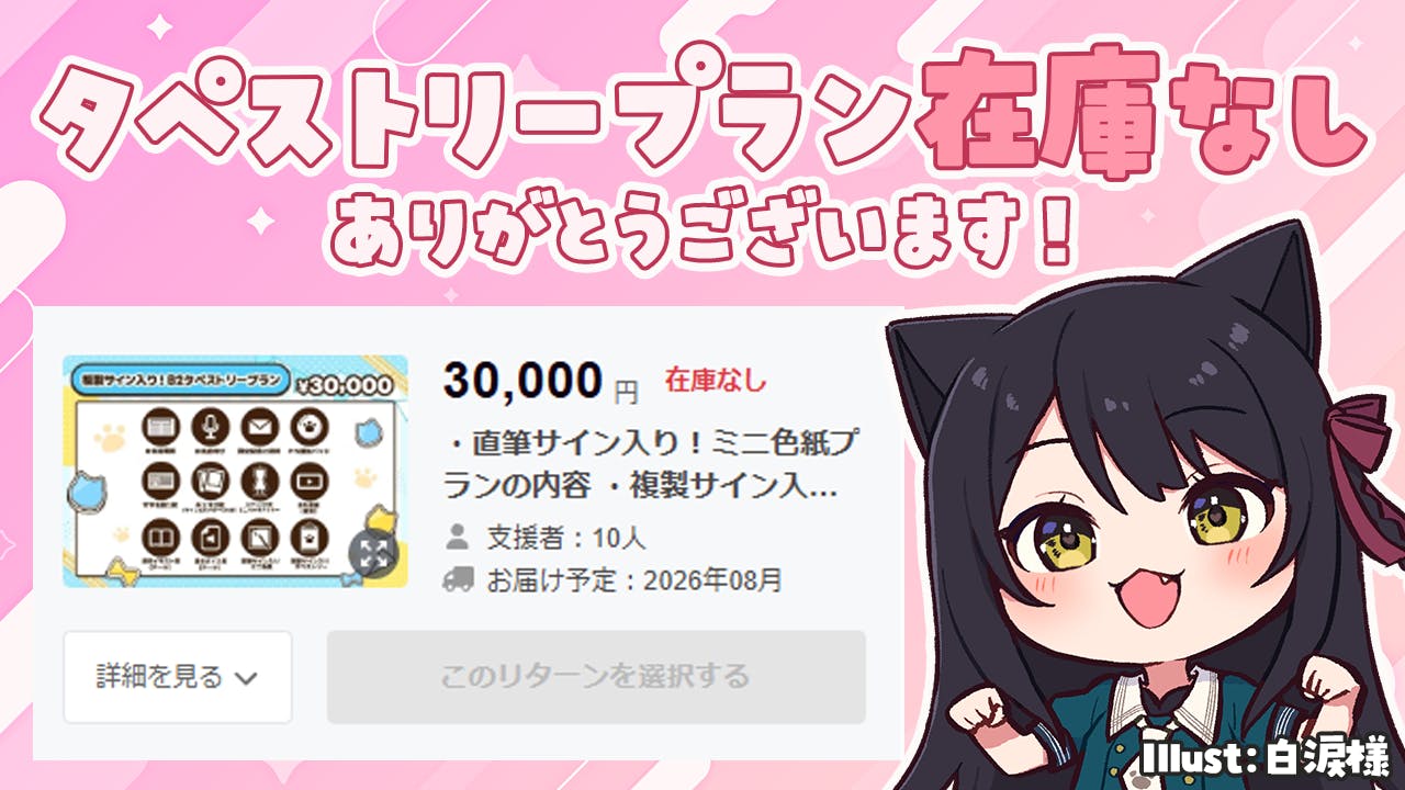 ななななんと!一番人気のタペストリープランがすべてなくなりました!ご支援いただいた皆様本当にありがとうございます!タペストリー+αの追加プラン(金額は前プランとの差額よりお高め)もご用意予定なので、タペストリーほしかったよー!という方も続報を待て!