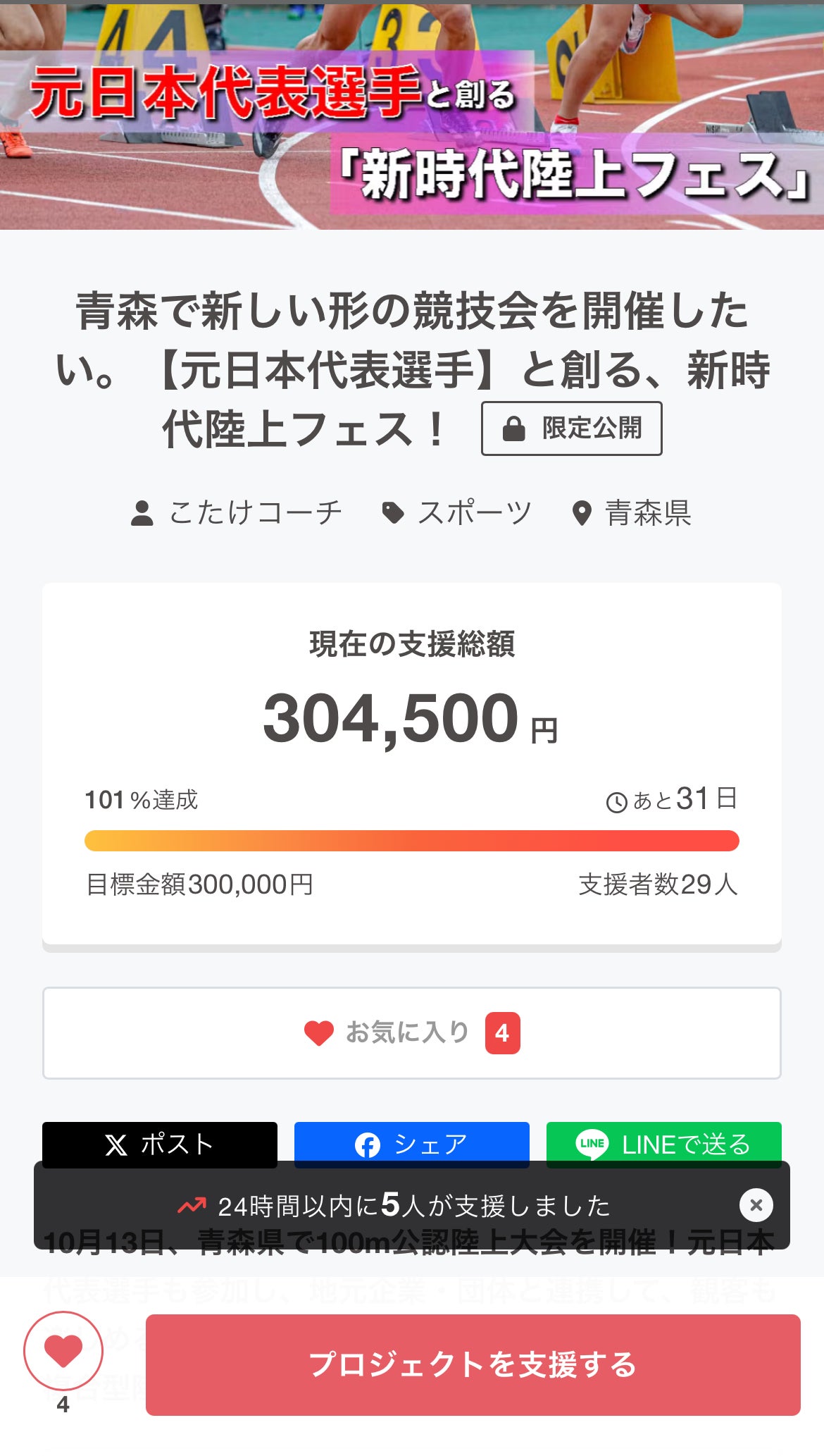 クラファンスタートしてから45日間本当に多くの方からのご支援とご協力で無事にクラウドファンディングを終えることができました!支援者数は51名!支援総額は¥388,500です!!!!こちらの支援金は全て大会運営に充てさせていただきます!たくさんの方の想いも背負って開催する今大会青森県の陸上の歴史に新たな一歩として踏み出す10/13参加する選手には本当に心の底から走ることを楽しんで欲しいどんどん大きな夢を持って自分の走りを磨いていって欲しいです自分は中学校の頃に本気でオリンピックを目指しました結果見ての通りオリンピック選手になることはできませんでした。でもこれは決して夢が破れた物語ではなく少なからず日本のどこかに青森県のどこかに同じように夢抱く日本代表になりたいオリンピックに出たい日本一になりたいそんな選手はたくさんいるだと思います。元日本代表をこの10/13に招致し、その世界で戦った走りを観戦することで子供たちが希望を見出し夢に向かって進むことができます。陸上を愛する大人も一緒に輝くことができます。今ではそんな環境を作ることが自分の使命であり全てをかけて挑んでいくことでもあります。そしていつか青森県からオリンピック選手が日本代表選手が生まれること。これが今の自分の夢になりました。支援された皆様、参加される選手の皆様当日会場に来られる全ての方で作る青森の新しいカタチの陸上競技会。全力で楽しんでください!青森県で誰よりも陸上を愛する1人藤田紘將より