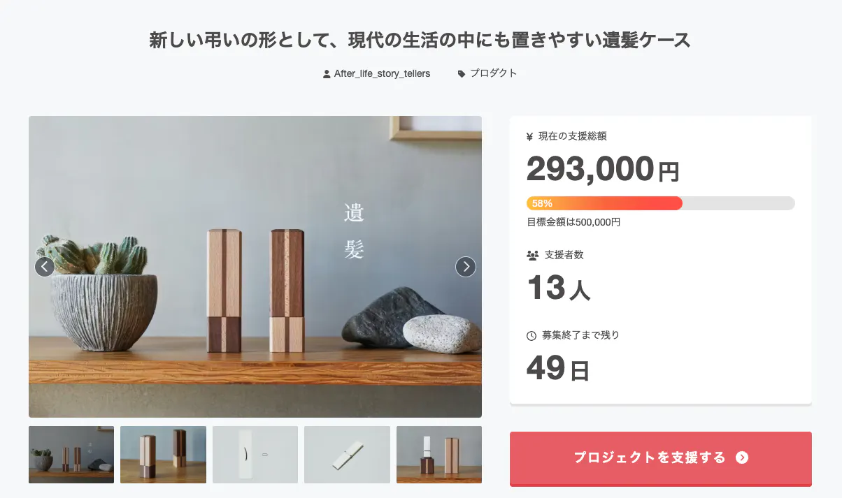 2026/01/18 20:58本プロジェクトにご共感・ご支援いただき、誠にありがとうございます。おかげさまで、目標金額の50%を達成することができました。日常生活の中で、生や死について深く考える機会は多くありませんが、「現代の生活に寄り添った弔いのかたち」を模索しながら、少しでも皆さまのお役に立てるプロジェクトにしていきたいと考えています。ご支援いただいた皆さまに、心より感謝申し上げます。 もっと見る
