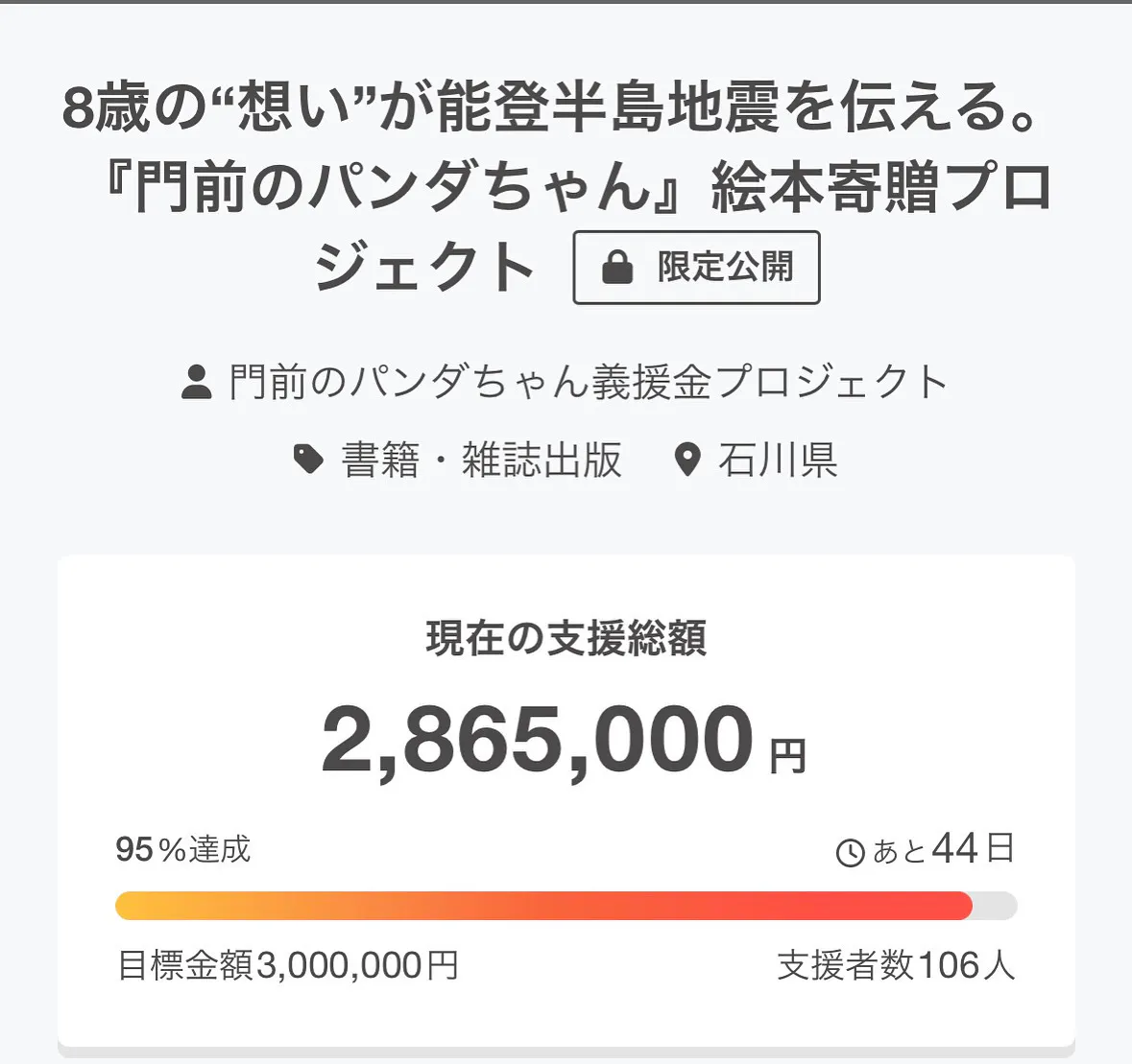 皆さまの温かい応援のおかげで、"目標金額の95%"に到達しました。