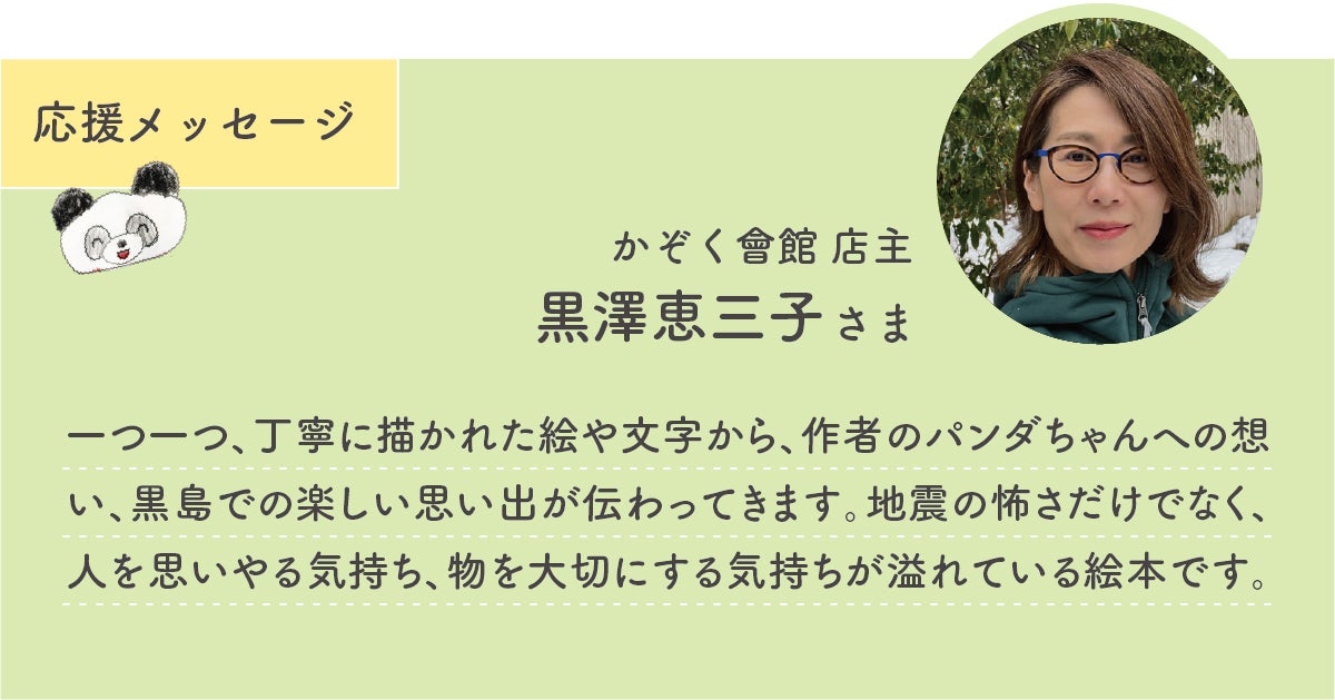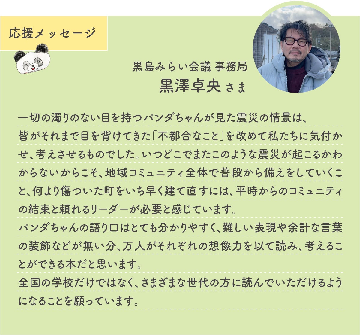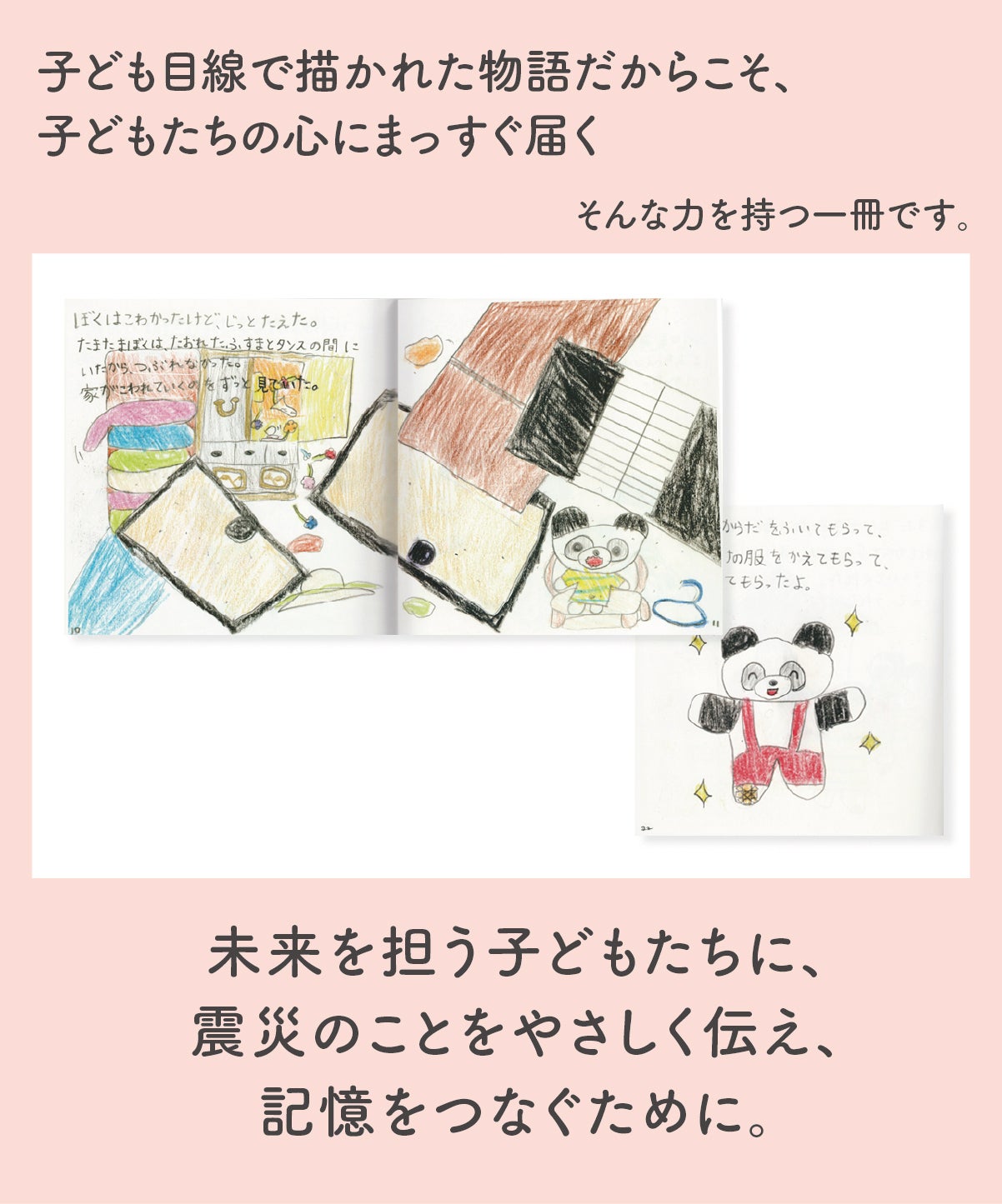 この絵本は、当時8歳の娘が「全壊認定を受けた家のパンダのぬいぐるみの気持ち」になって描いたものです。子どもの素直な言葉と絵で綴られており、地震を知らない子どもたちにも、やさしく震災の記憶を伝えることができます。