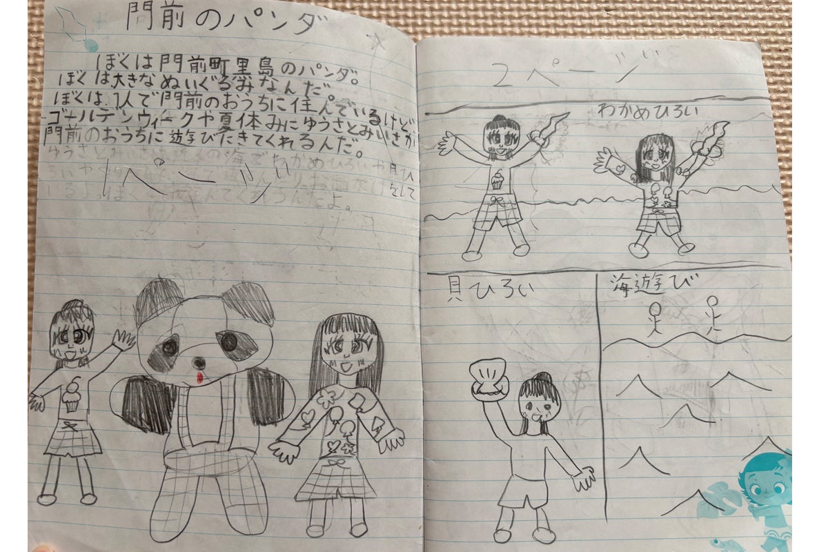 娘は、その時私が撮影した動画や、実際に自分の目で見た黒島の様子を思い出しながら、この経験を忘れないようにと絵本を描きました。そうして生まれたのが「門前のパンダちゃん」です。