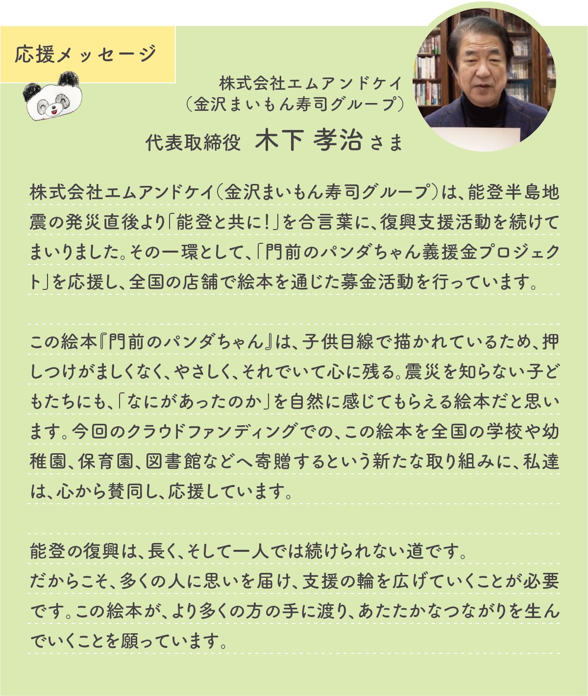 能登半島地震をテーマにした絵本「門前のパンダちゃん」を増刷し、全国の学校・こども園・幼稚園・図書館等へ寄贈したいと考えています。
