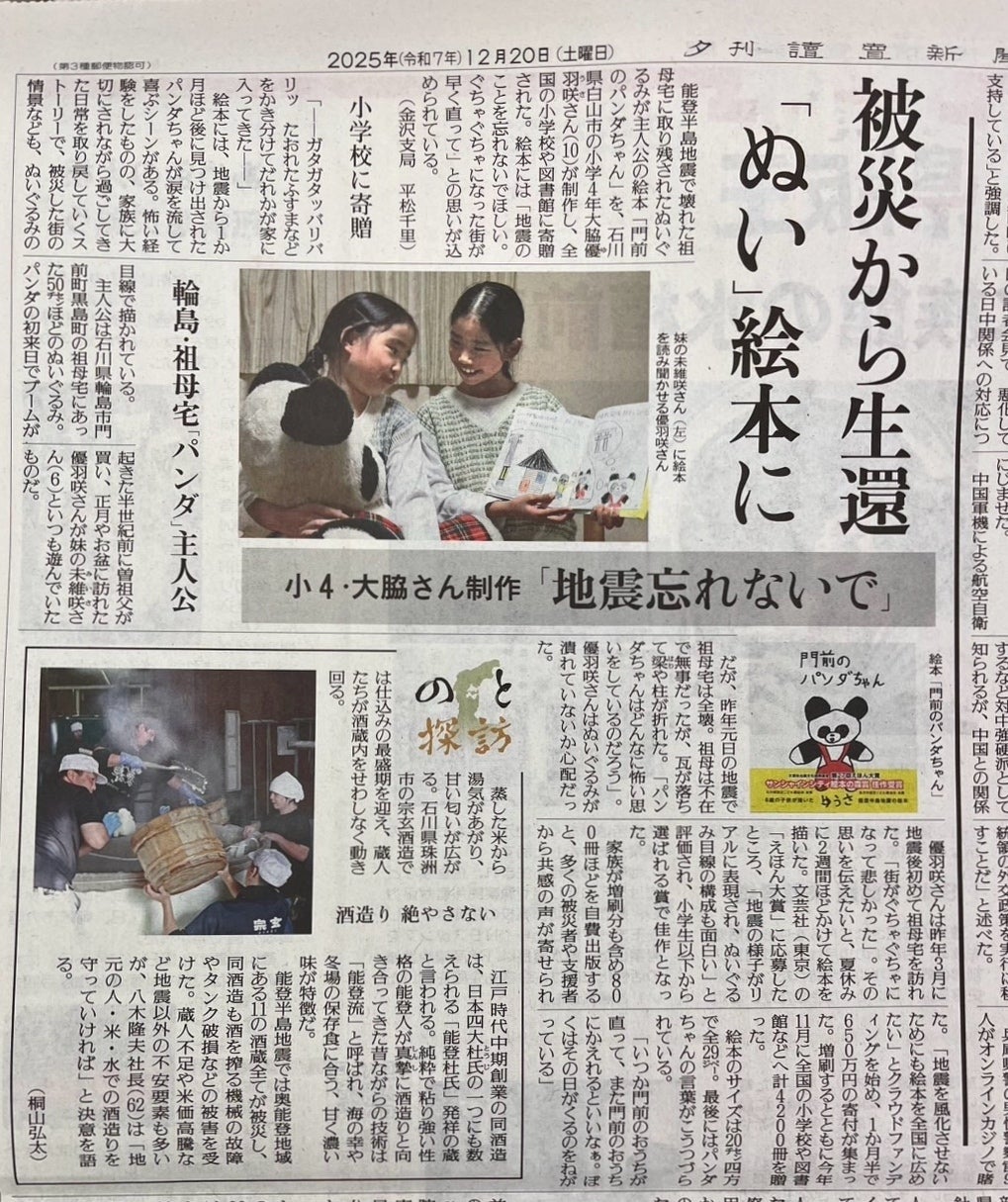 2025/12/21 20:12先日ご報告いたしました通り、「門前のパンダちゃん 絵本寄贈プロジェクト」は、全国の小学校・こども園・図書館への絵本の一斉寄贈を、無事に終えることができました。このたび、その取り組みについて読売新聞の夕刊に掲載していただきました。この絵本と活動が、こうした形でさらに多くの方の目に触れる機会につながったことを、ありがたく感じています。ご支援いただいた皆さま一人ひとりに、心より感謝申し上げます。 もっと見る