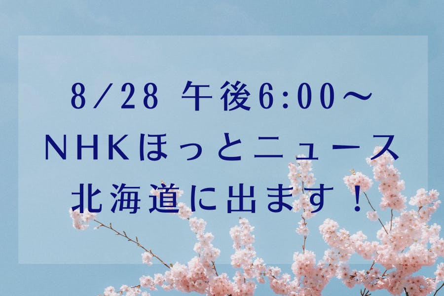 皆さん、こんばんは!サクラもちです。毎日のオンラインスクールやMIT報告スライド作り&動画撮影、高校体験&見学と毎日いろいろなことがあって時間があっという間に過ぎてしまいます(;´・ω・)8月21日(木) にNHKほっとニュース道北・オホーツクで放送してもらった取材が、全道でも放送されることになりました!!!8/28(木) 午後6:00〜 NHKほっとニュース北海道に出ます!https://www.nhk.jp/p/hotnews-hokkaido/ts/G9MR9K9QJ6/schedule/?area=010恥ずかしいですが、見られる地域の人はぜひ見てください(*- -)(*_ _)ペコリ