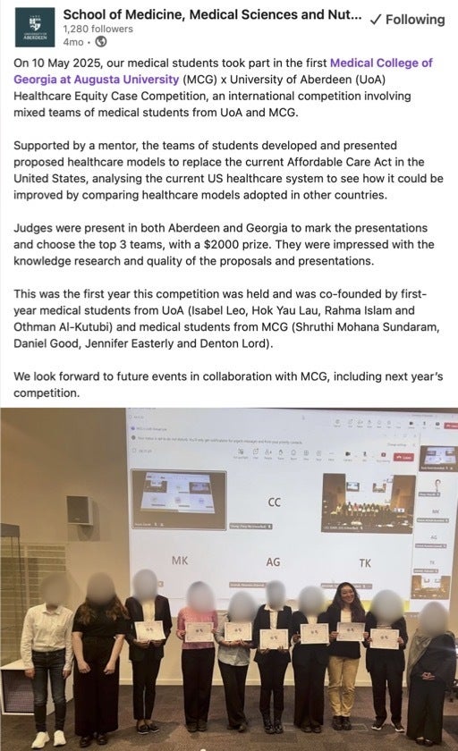 アバディーン大学の医学部はイギリス国内で高い評価を受けており、The Guardian "Best UK universities for medicine – league table" 2025年度では一位になっております。こちらから見れます。