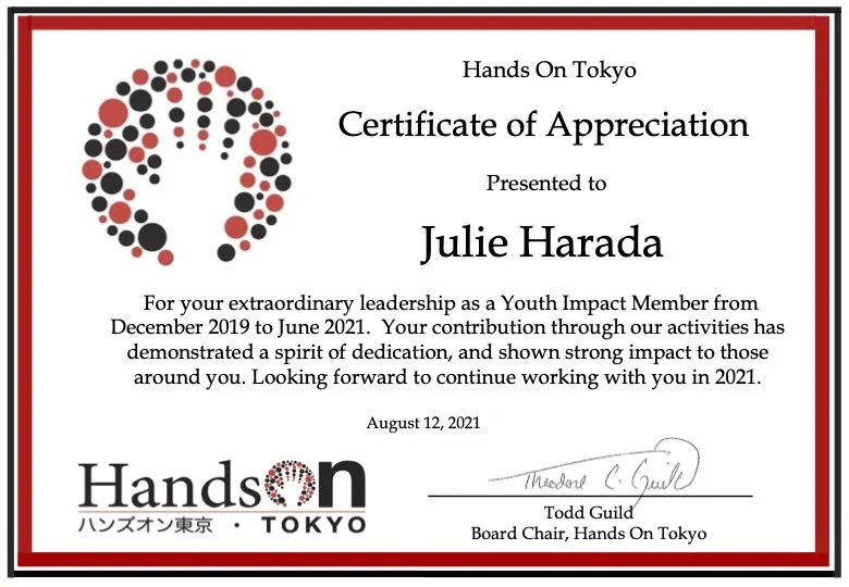 During my senior year of high school, I represented my school through the NPO Hands On Tokyo, volunteering in the community. For this work, I was honored with the Youth Leadership Award, which affirmed my ability to create meaningful change through leadership. Later, during the COVID-19 pandemi
