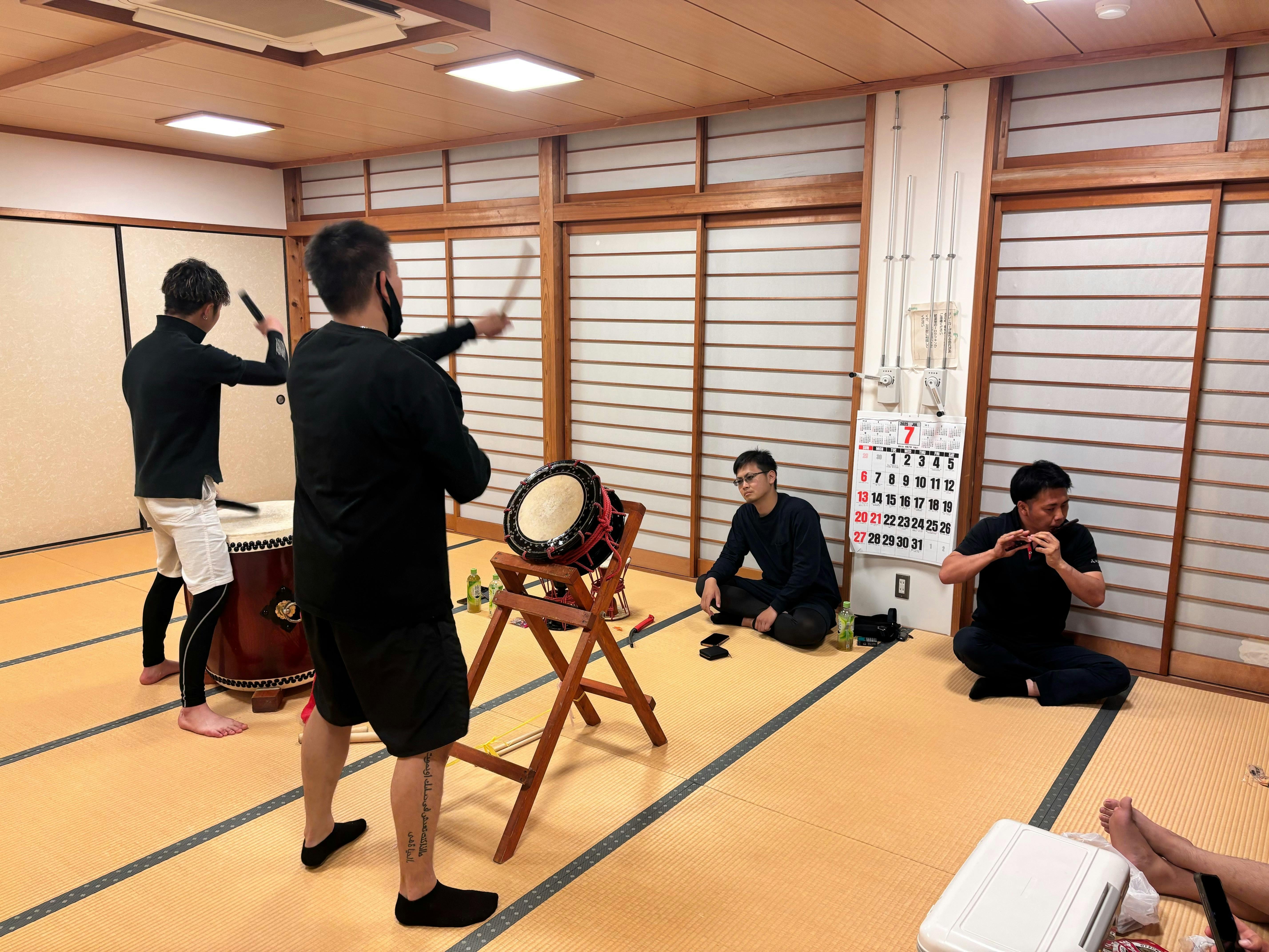 沖ノ島まいりを今週末に控えて練習にも熱が入ります。地域交流センターあしぱるでは沖ノ島一心会(沖心会)の皆さんが太鼓浮立の練習をされてます。この時期は各公民館から若者が叩く太鼓の音が聞こえてきます。私たちは、この音を聞いて夏祭りが近いなぁと感じます。