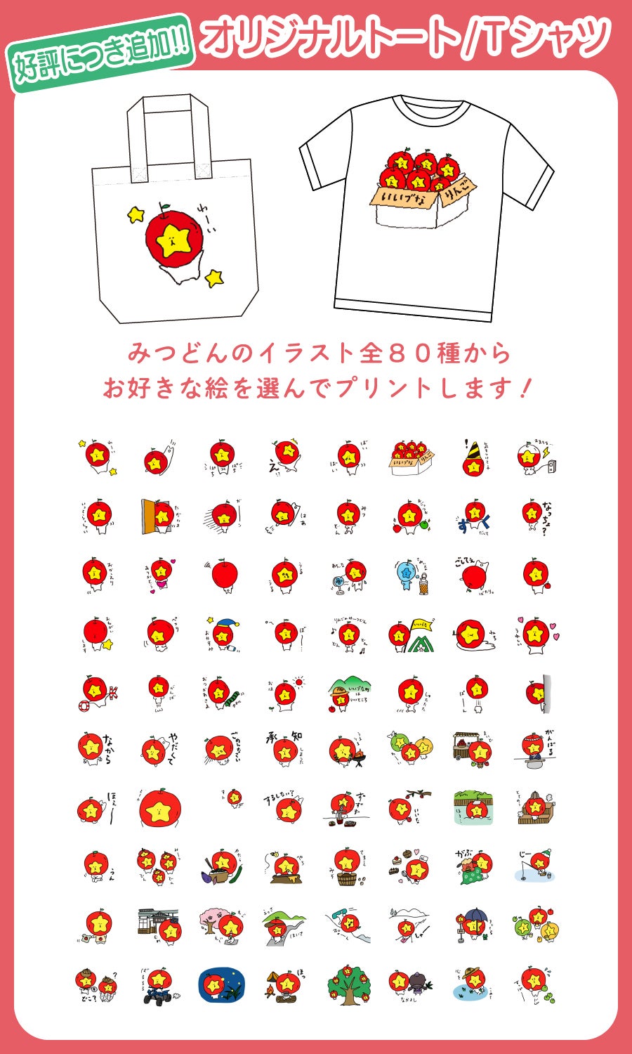 LINEスタンプにも使われているみつどんのイラスト全80種からお好きなイラストをプリント!オリジナルのトートバッグ・Tシャツをお作りいただけます。
