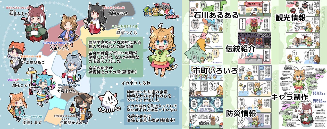 災害に対し一方向からの支援をいただくだけでなく、こちらからも自分の作れるものを提供しつつ、能登や各市町の魅力を伝えたいという考えで活動を開始し、10か月間で250枚ほどの漫画とイラストを描き、毎月1人能登の市町をイメージしたキャラを制作しています。