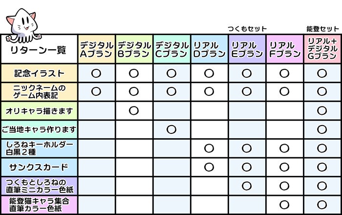 ※以下のプランはすべて【リアルDプラン】のリターンを含みます。【リアルEプラン(つくもセット)】9,900円 …つくもとしろねのミニカラーイラスト色紙