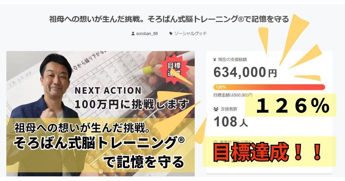 みなさまのお力添えにより、目標金額であった【50万円】を大きく超え、支援総額【634,000円】達成率【126%】そして【108名】もの方々からの温かいご支援をいただくことができました。
