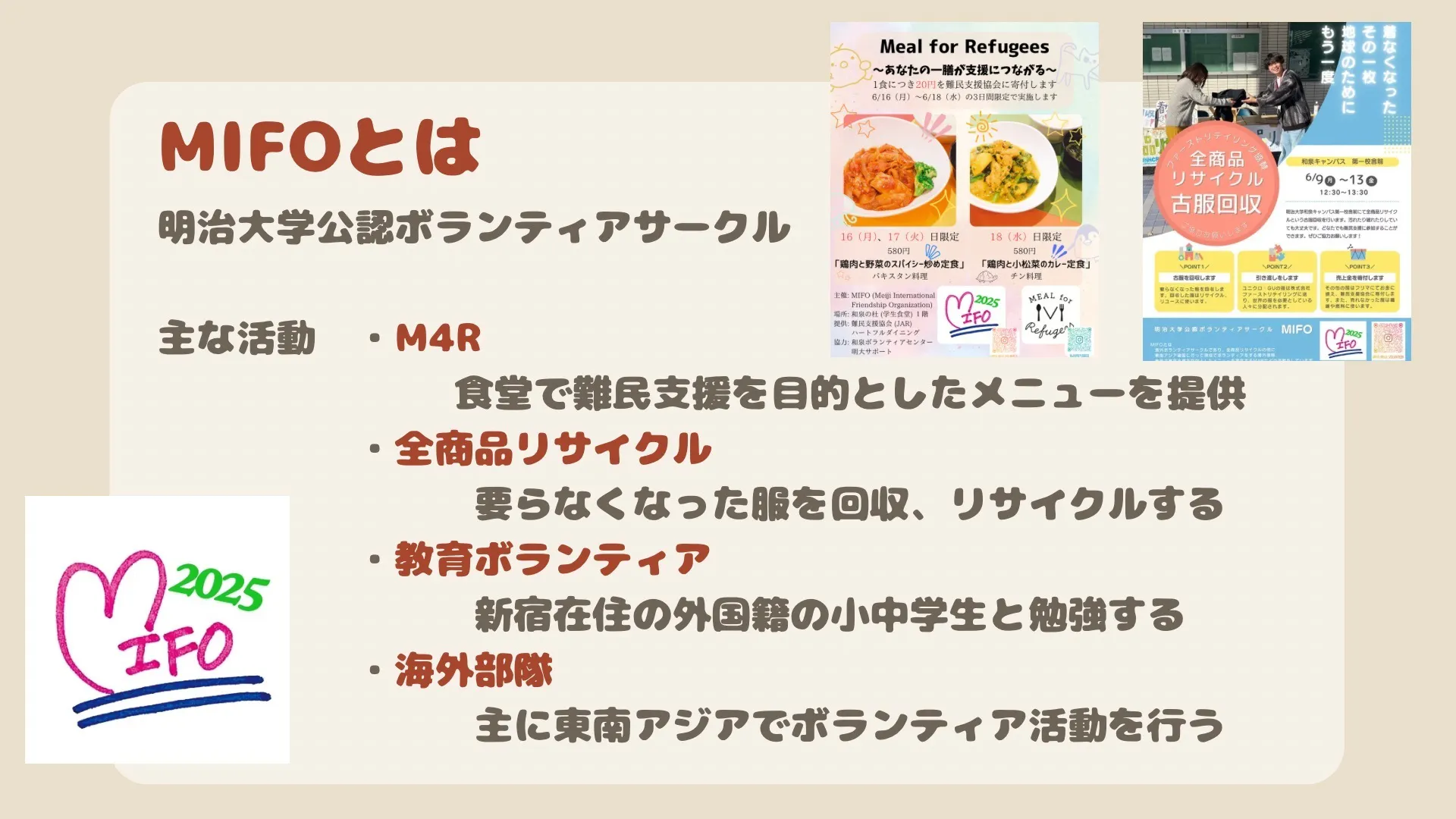 MIFOの活動は、学生が自ら考え、自ら動き、世界とつながる挑戦です。