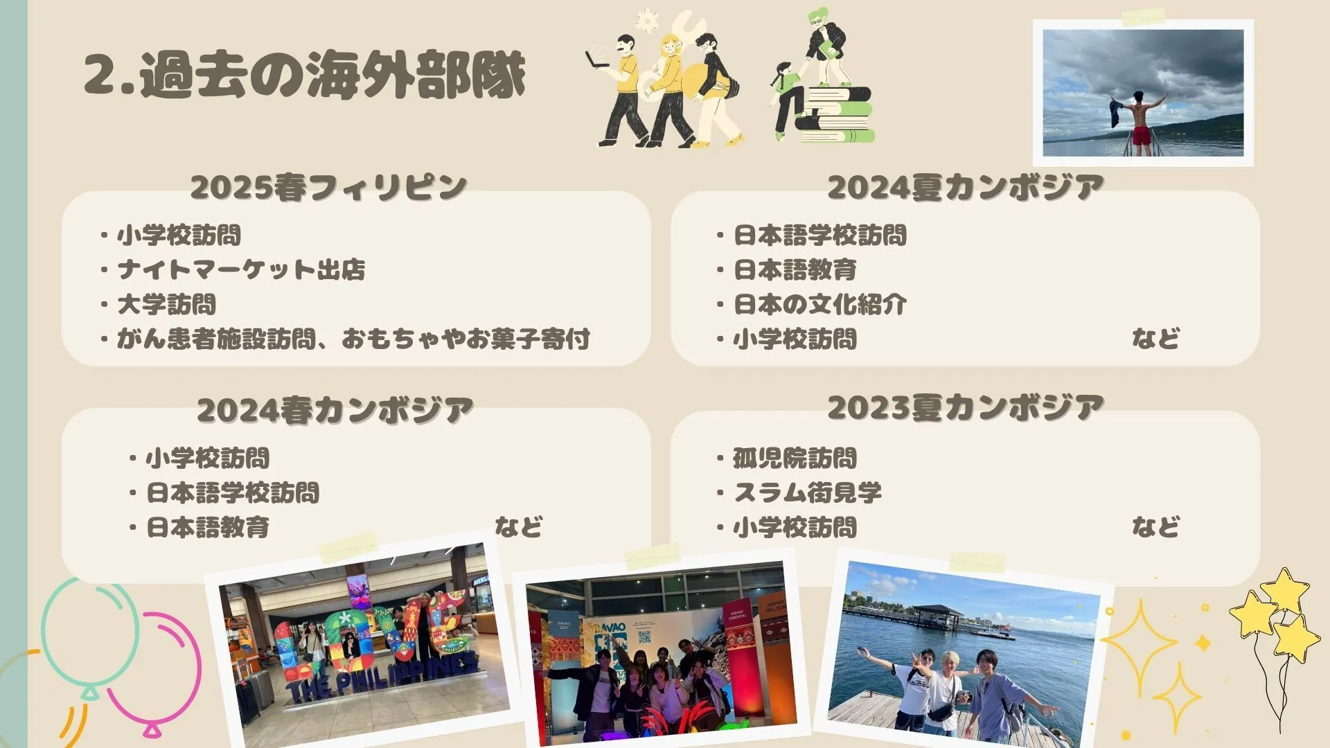 今回の海外部隊では、日本人が経営するカンボジアの孤児院で、日本語教育・日本の文化紹介や子どもたちとの交流を目的とした運動会などを含むボランティア活動を自分たちで企画・実施する予定です。