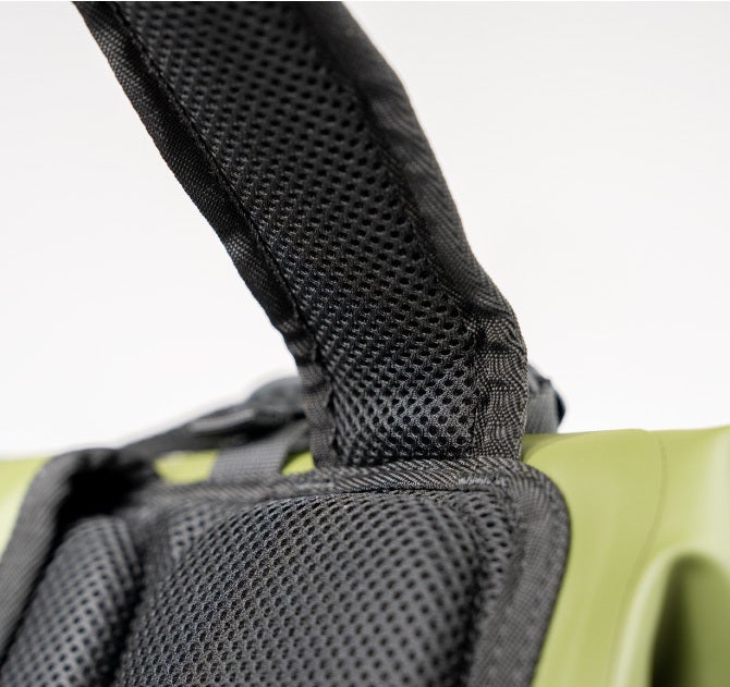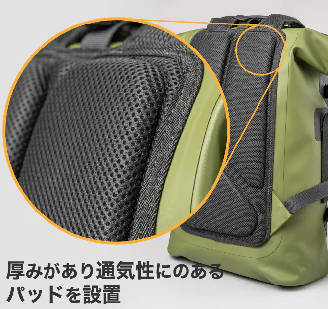 長時間の使用でも快適に背負っていられるように、通気性のあるパッドを背中部分に配置。