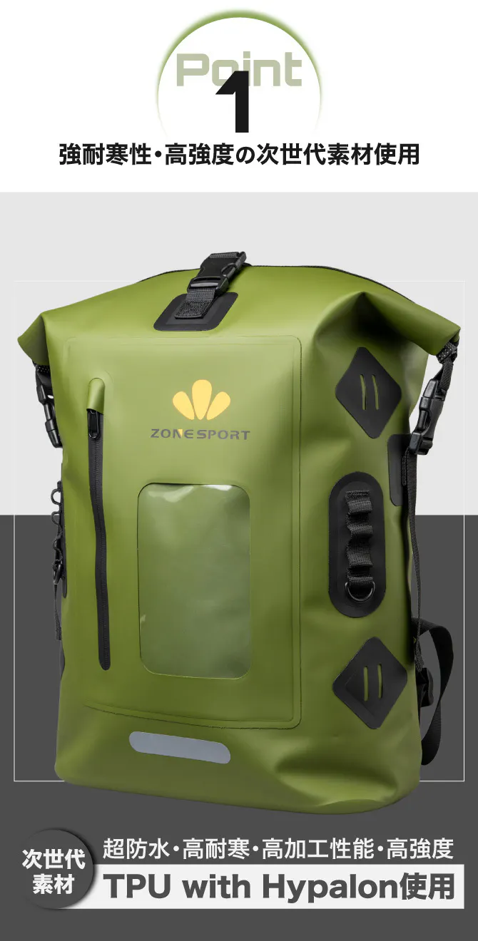 TPU with Hypalonは耐寒性も高く、PVC素材は寒冷地ではバッグ素材が硬くなり使いづらかったですがこのTPUハイパロン素材は全く硬くならず扱いもスムーズで快適です。