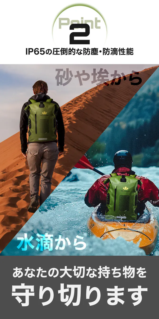 IP65の防塵防滴性能を有し、あなたの大切な持ち物を砂や埃、水滴からしっかりと守り切ります。