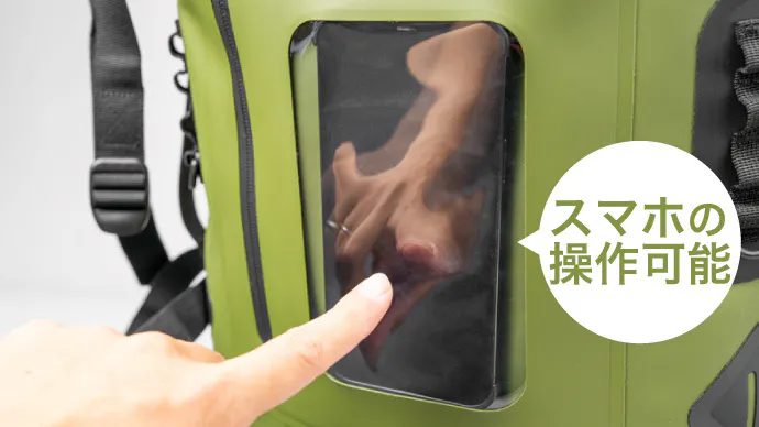 外側に防水ファスナーを備えた小さな窓付きポケットを1つ。