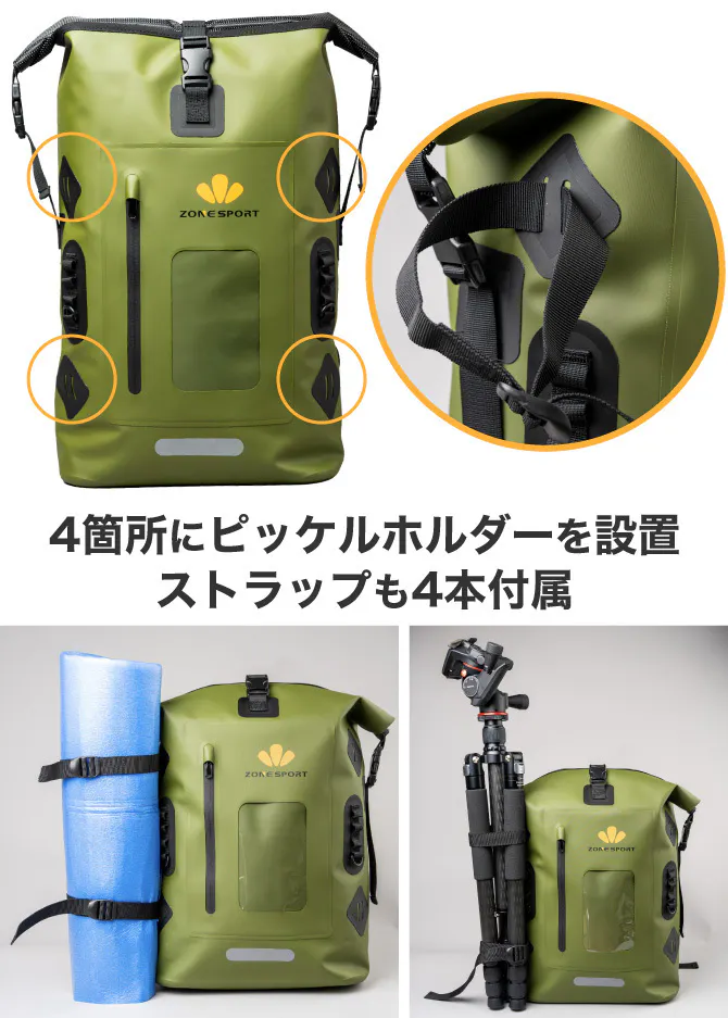 4箇所にピッケルホルダーを設置し、アウトドアで役立つ仕様になっています。