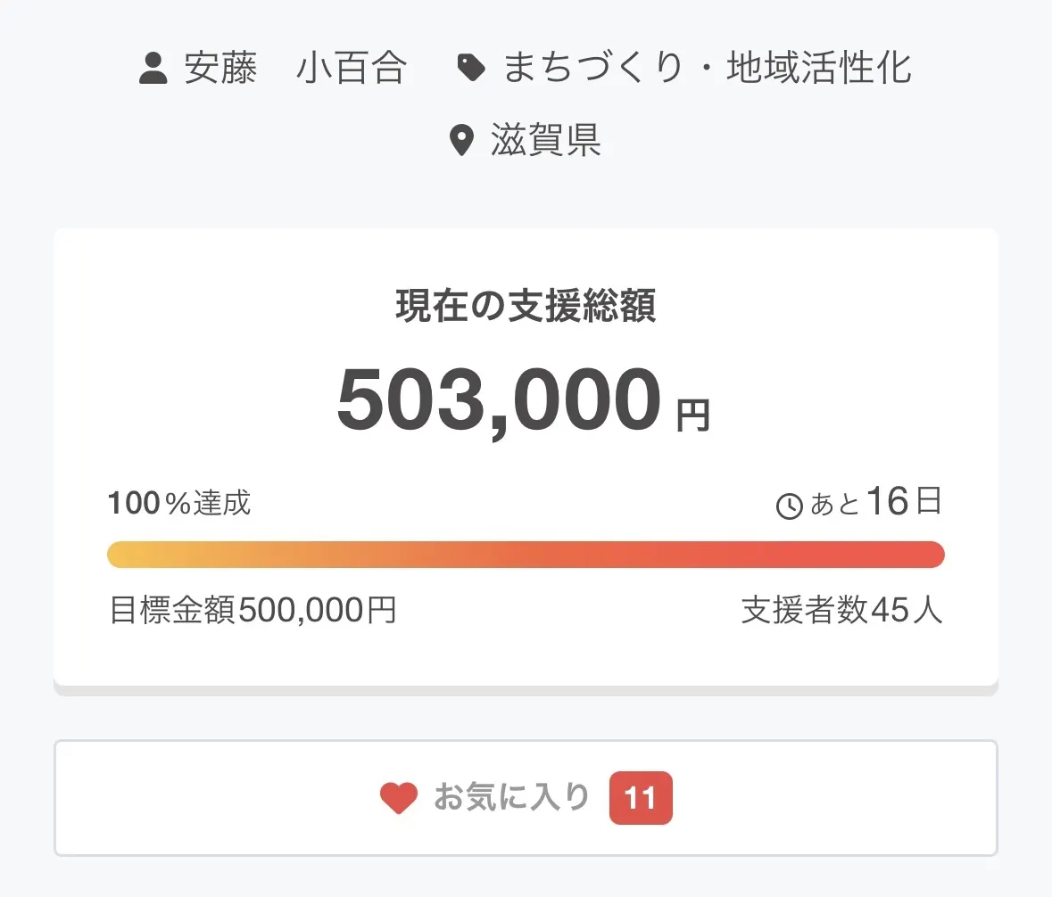皆さん、ありがとうございます!目標のご支援50万円を達成しました。これも皆さんの応援、ご支援、シェアのおかげです。感謝で胸がいっぱいになっております。