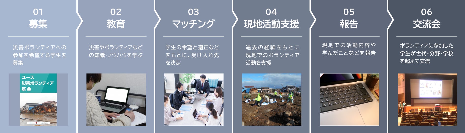 これまで、以下のような流れで、被災地のニーズと若者の力をつなげるコーディネートや、災害ボランティアの研修などを重ねてきました。