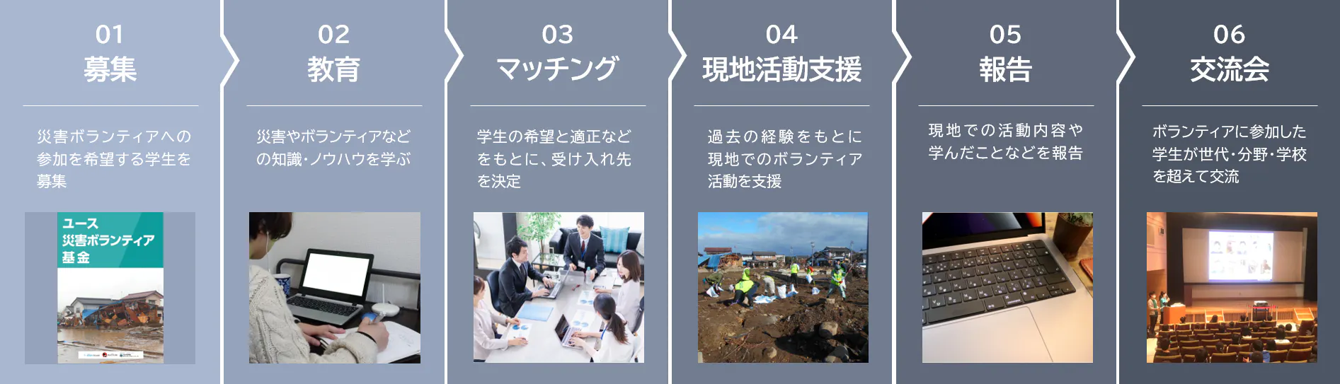 これまで、以下のような流れで、被災地のニーズと若者の力をつなげるコーディネートや、災害ボランティアの研修などを重ねてきました。