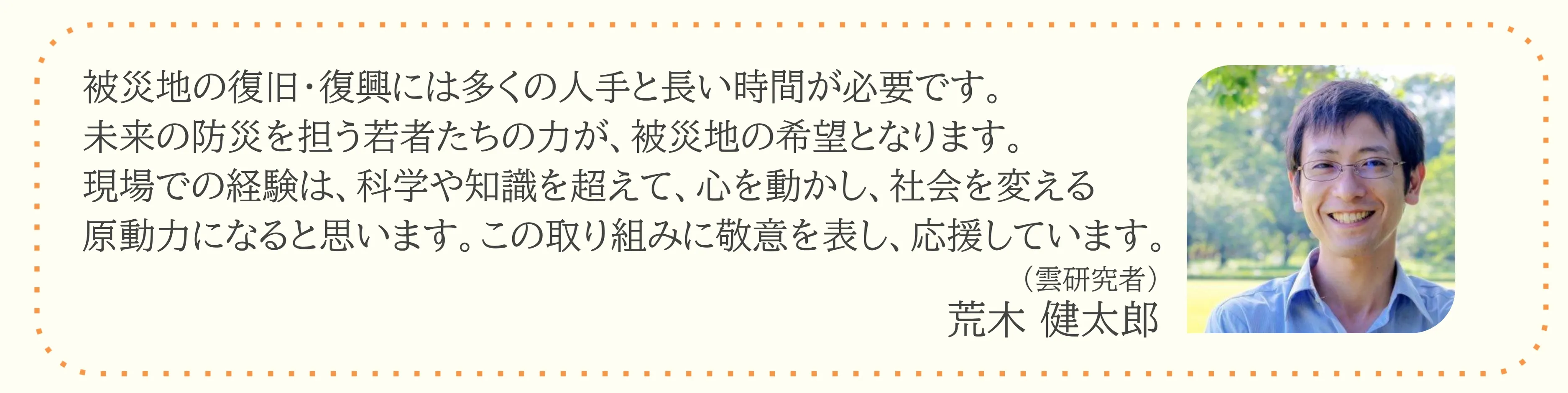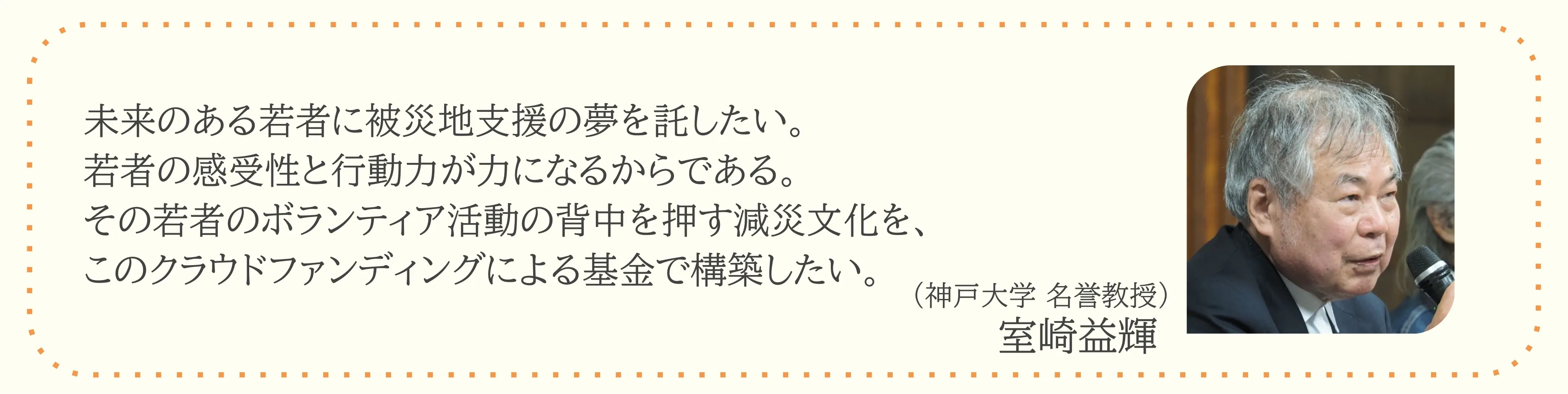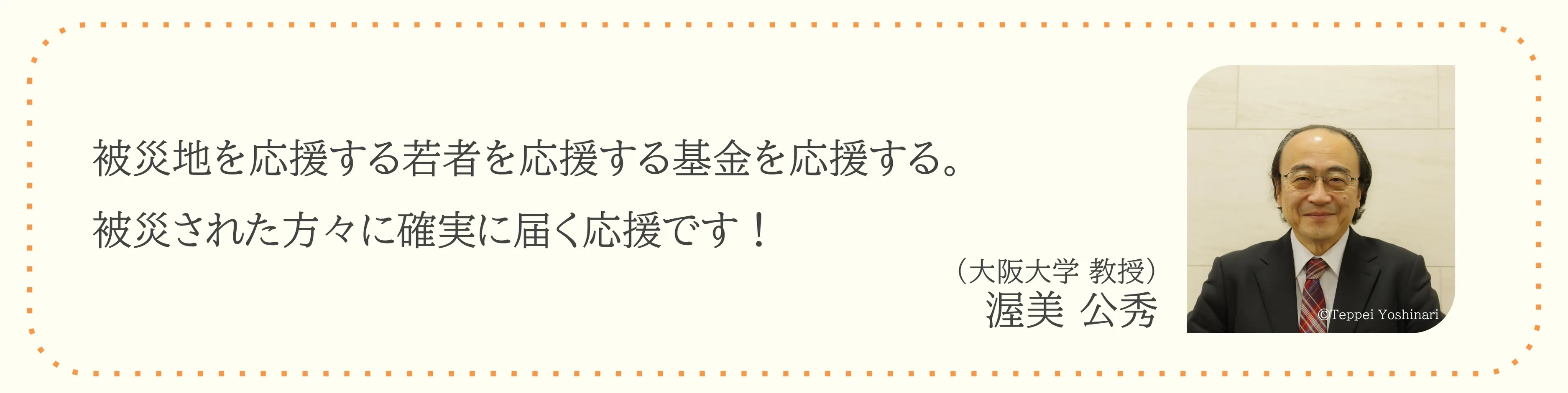 この基金を通して、若者の交通費や滞在費、活動に必要な装備を支援し、災害現場での学びと実践の機会を広げていきます。