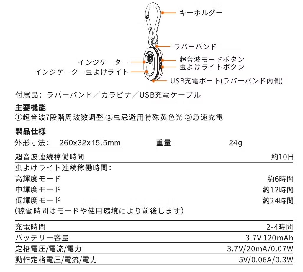 MINI REPELⅡは、蚊が嫌がる7種類の音波を360度全方位に拡散し、不快な音で虫の接近をブロックします。人間の耳にはほとんど聞こえないほど微弱ですが、虫にとってはしっかりとした刺激になります。