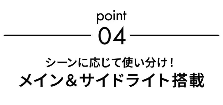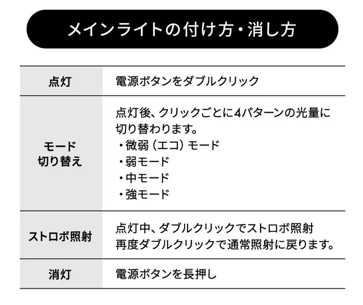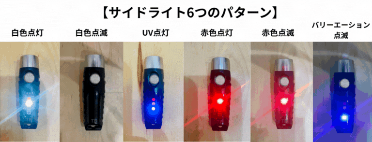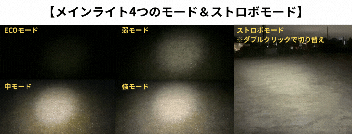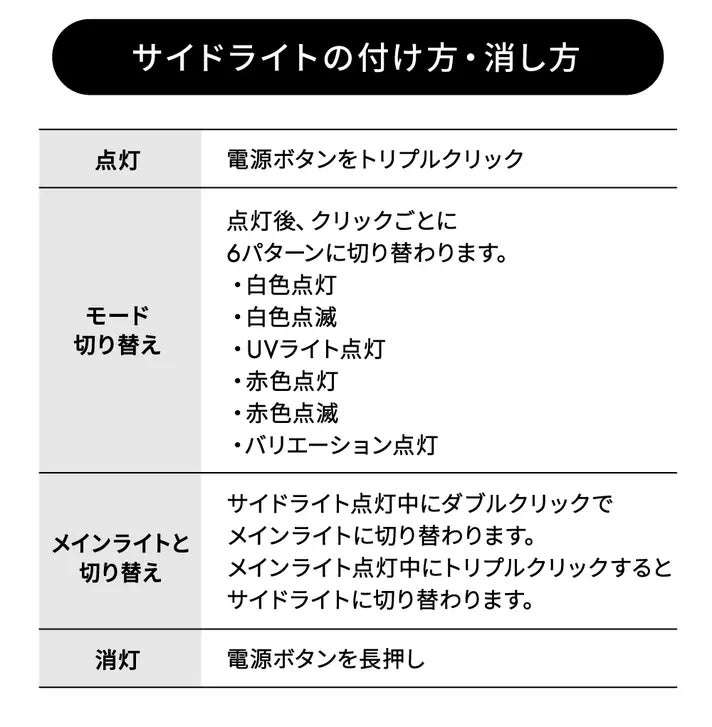 A:メインライトには4段階の明るさ+ストロボ、サイドライトには白色/赤色/UVライト/点滅モードなど6種のバリエーションがあります。