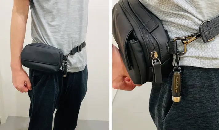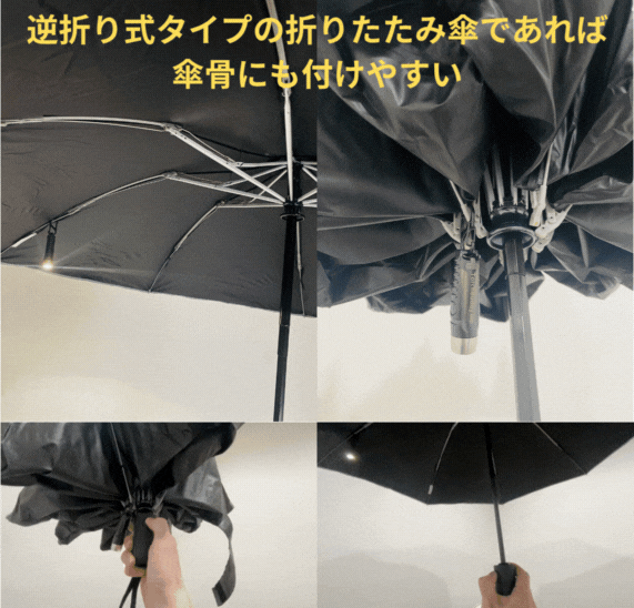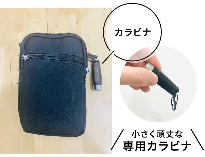 A:付属のカラビナを使って、傘の骨やリストバンド部分に簡単に取り付け可能です。取り外しもスムーズです。