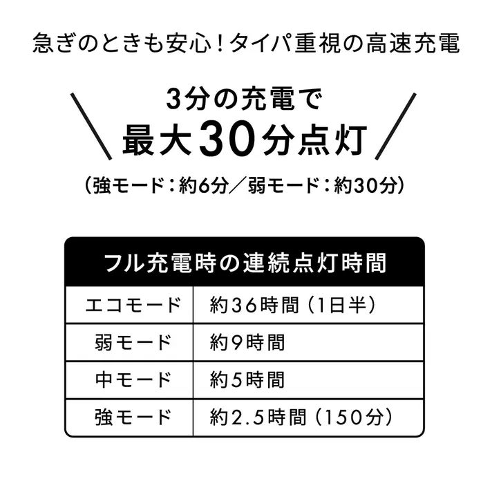A:点灯モードにより異なりますが、エコモードで最大約36時間、強モードでも約2.5時間使用できます。