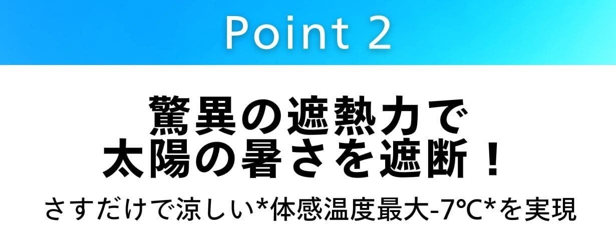 ※体感温度は、外気温36.7℃の環境下で本商品により日差しを遮った際に30.7℃を計測した結果に基づきます。