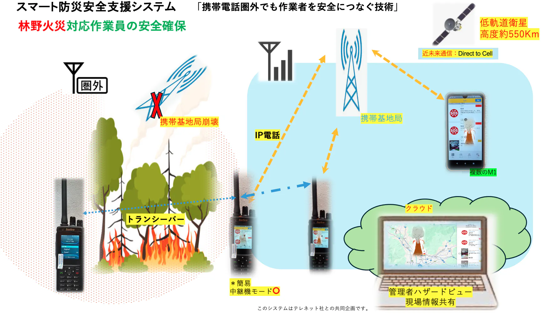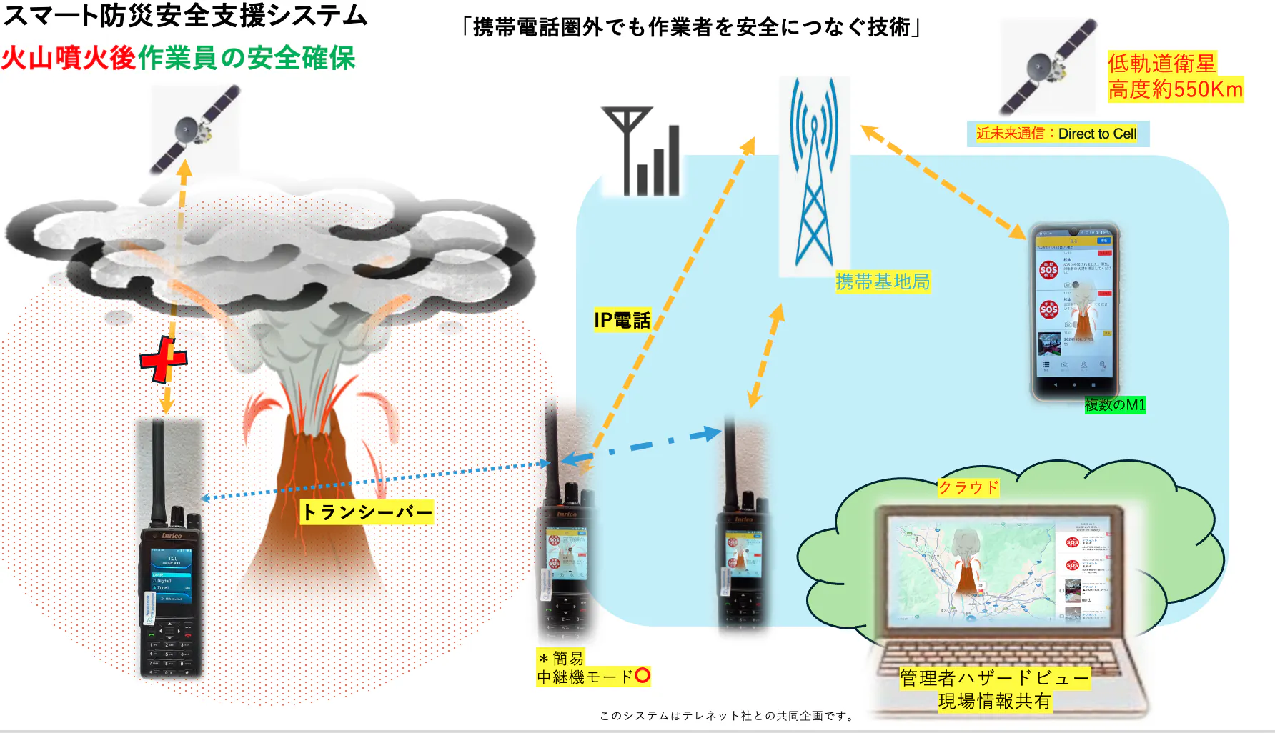 三次元測量(OWL/アドイン研究所)、衛星通信機器(ハザードトーク/テレネット)、そして自社開発のSOS検知アプリを組み合わせた、現場のための“命の道具”です。