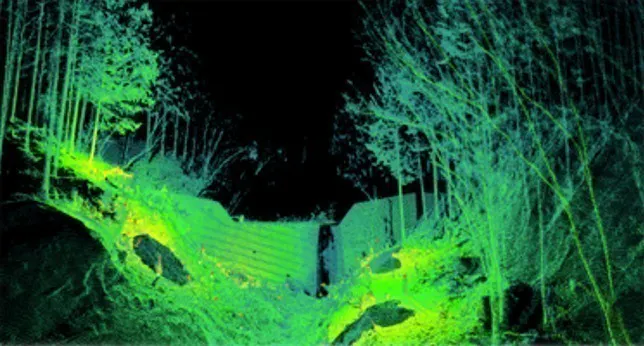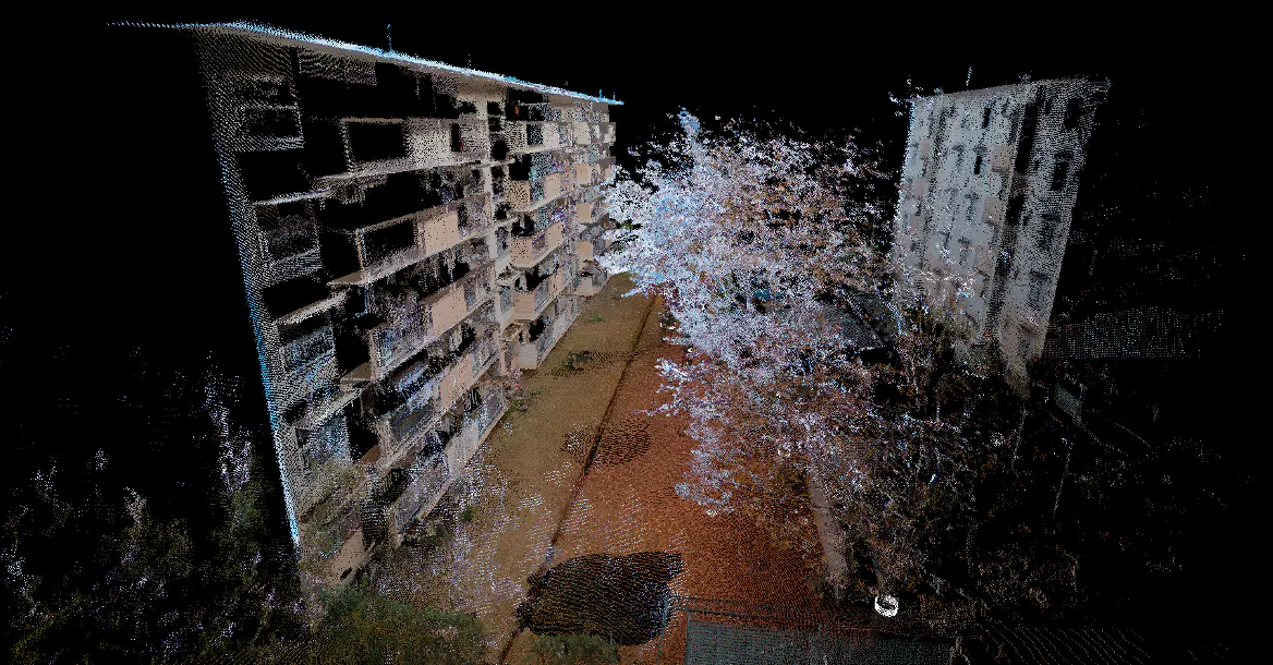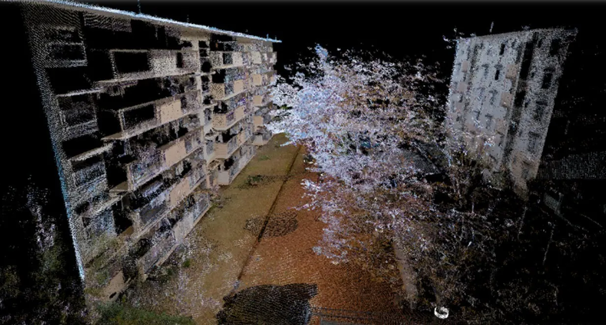 OWLで崩壊ビルをスキャン、点群データとして可視化した画像です。この画像を元に支援計画を立てます。