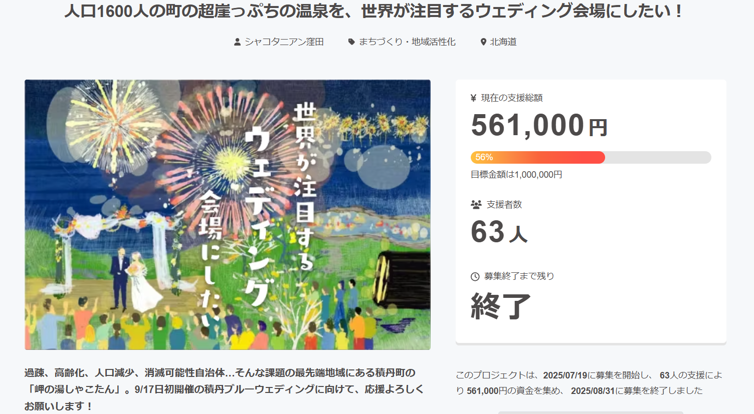 2025/09/02 15:55この度は、私たちのプロジェクトへご賛同いただき、ご支援くださった皆様へ、心より感謝申し上げます。当初、私たちのウェディングは親族や近しい方々のみで静かに行う予定でしたが、いま積丹町で取り組む「まちづくり」の延長として、この機会をみんなに知ってもらいたい、そして町の新たな可能性を広げたいという思いから、プロジェクトとして発信する決断をしました。個人のウェディングでクラウドファンディングを行うことはできないため、地域活性も兼ねた形でチャレンジしました。こういった情報発信が後手に回ってしまった点、そして目標金額を達成できなかったことは全て私たちの力不足です。しかしながら、多くの方々から温かいご支援と応援をいただき、心から御礼申し上げます。積丹には、私たち自身が移住者として感じた“最幸”の魅力があります。人口1700人未満の地域で、温泉・絶景・地元の食、そして新しいチャレンジが生まれています。過疎や事業承継の課題もありますが、だからこそ新たなイノベーションを生み出し、世界に誇れるShakotanを目指していきます。皆様へのリターンは、順次発送の準備を進めて参ります。まずは、9月17日のウェディング開催に向け、全力を尽くしてプロジェクトを進めます。そして引き続き町の未来をつくる活動を続けて参ります。今回のご支援が私たちにとって大きな力となりました。今後とも温かく見守っていただければ幸いです。そして積丹町が、皆さんの第二の故郷となるような、ハッピーな場を創り続けます。心より御礼申し上げます。 もっと見る