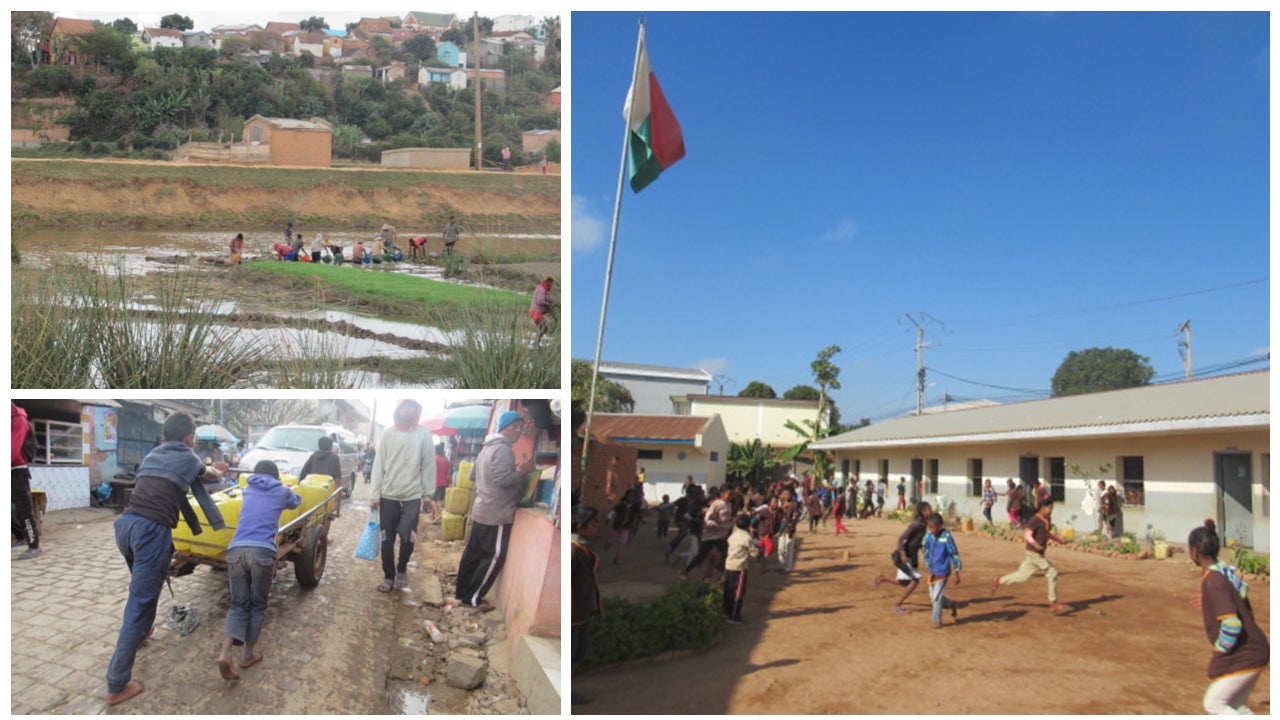 漁をする青年達、水を運ぶ青年達、公立小学校の校庭で遊ぶ子ども達の様子