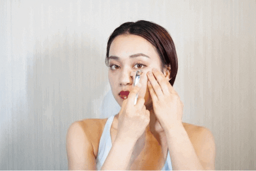 ①小鼻の付け根にスクレイパーの突起をあて、鼻の下に向かって動かします。