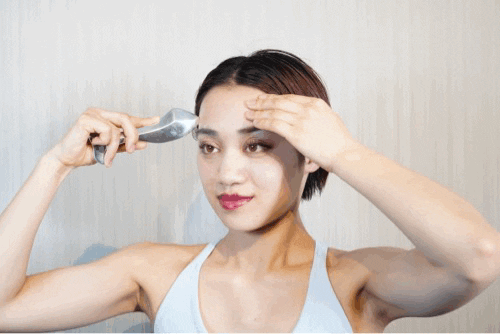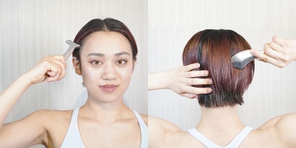 眉毛の上から前髪の生え際の間でスクレイパーを動かします。