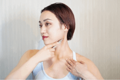 アゴを突き出すようにして片手でアゴの皮膚を耳に向かって引っ張ります。