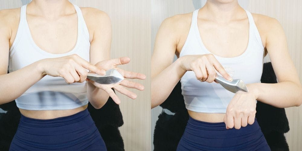 筋膜ケア時には、熱を持った部位からは熱を吸い上げ、持った手の温度にスクレイパーの温度が適応する為、冷えて硬い部位には程よい熱を与えて血行促進に役立てる事ができます。