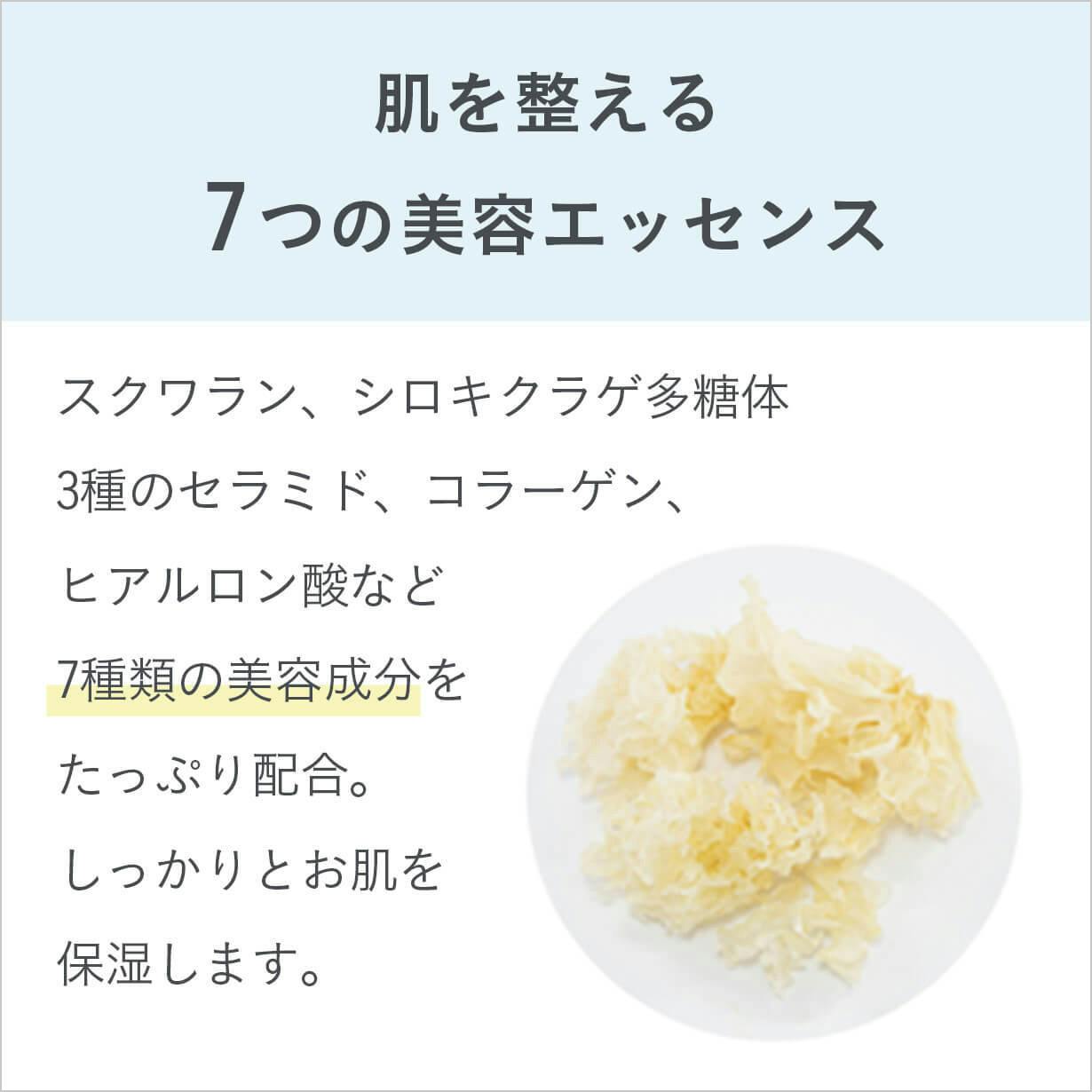 肌荒れを防ぐ10種類の植物エキスと肌を整える7種の美容エッセンスが、肌に潤いと柔軟性を与えます。