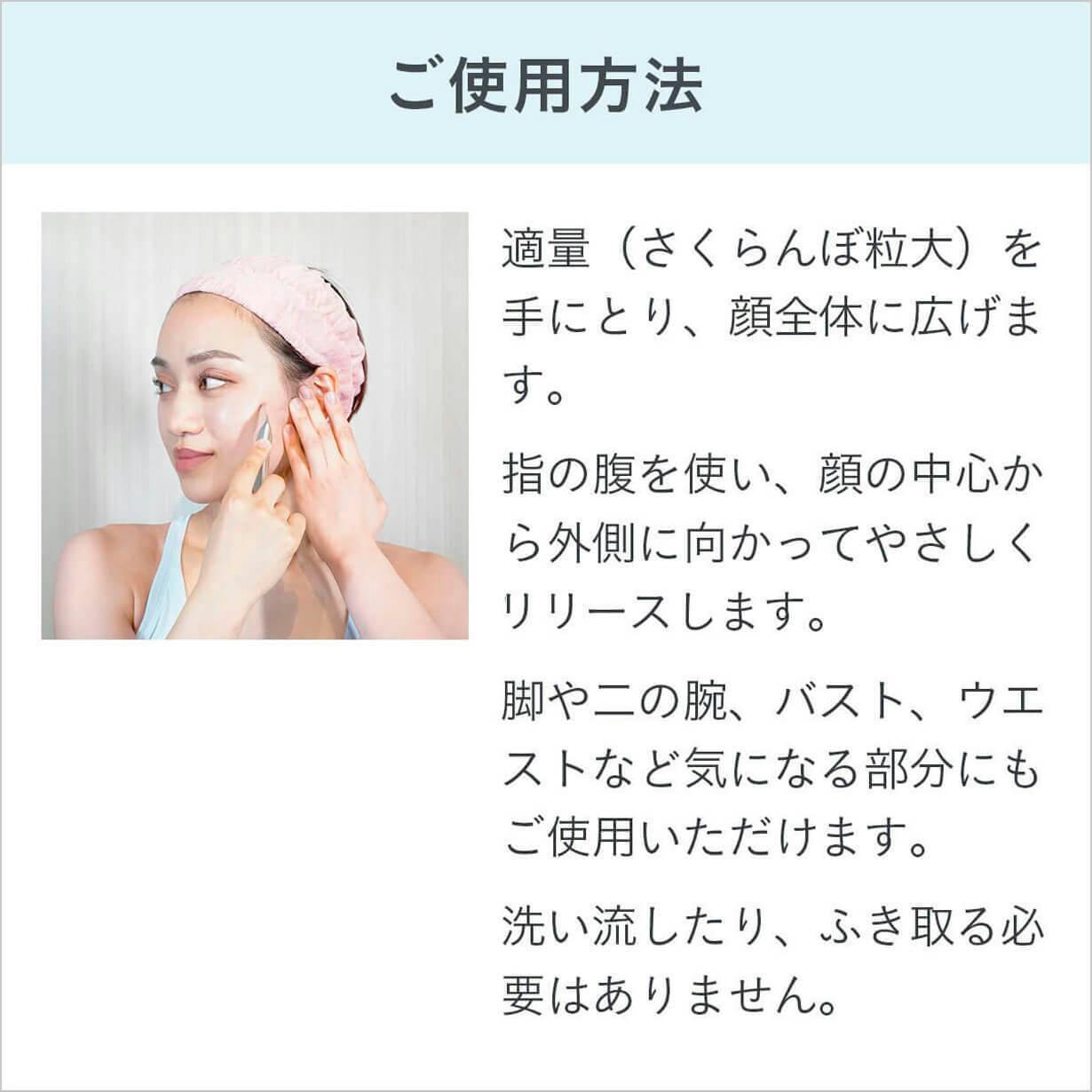 皮膚の水分を保ち、保湿効果が高く油っぽさやベタつき感がないさっぱりとした仕上がりなので、普段のお手入れにも活用いただけます。