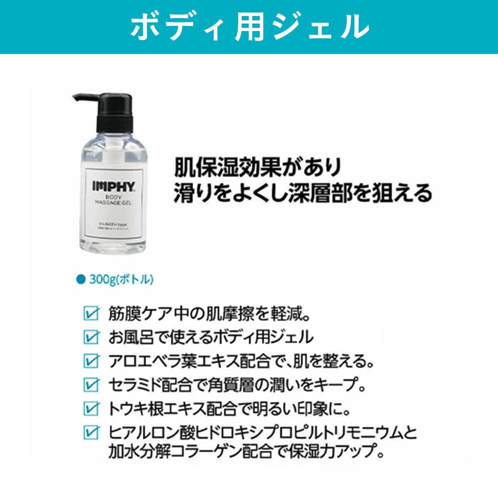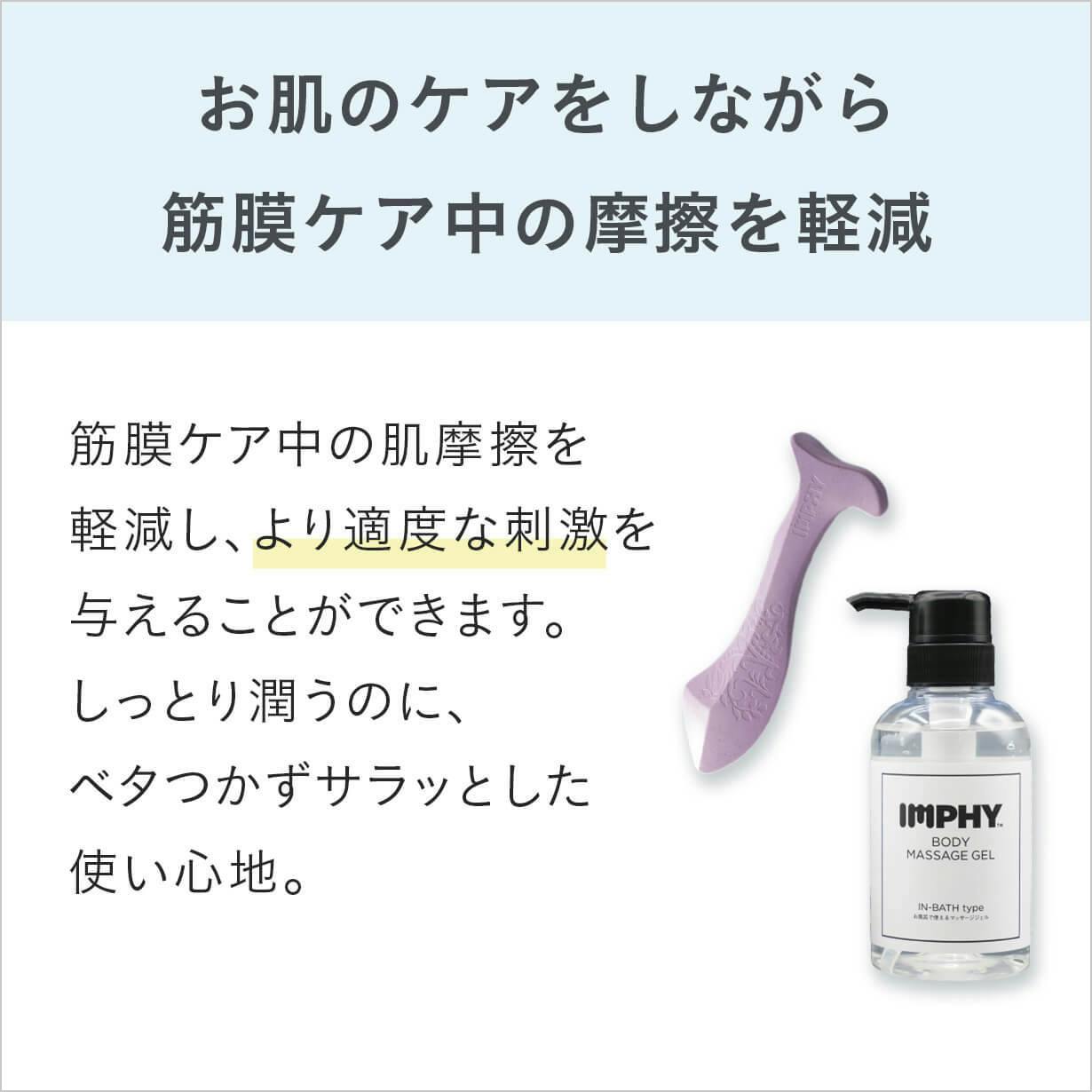 IMPHYのジェルは、スクレイパーを使用した筋膜ケア時に使用すると、肌摩擦を軽減し、より適度な刺激を与えることができます。