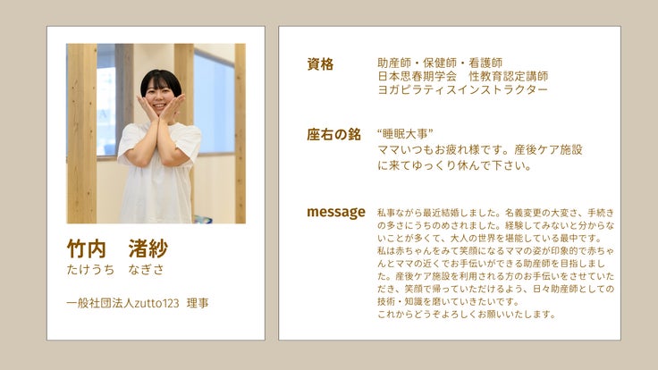同じ病院で勤務し、私の後輩である竹内渚紗(助産師)は「いのちの授業(性教育)」をやりたい!という夢を語ってくれました。困っている人を放って置けない優しさ、赤ちゃんや小さな子どもとの関わりも上手で行動力もある彼女と一緒に産後ケア施設を作って、2人で一緒に夢を叶えようと決心しました。