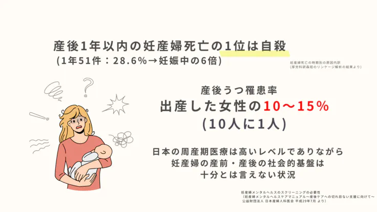 産後1年以内の妊産婦死亡の1位が“自殺”であることをご存知でしょうか。