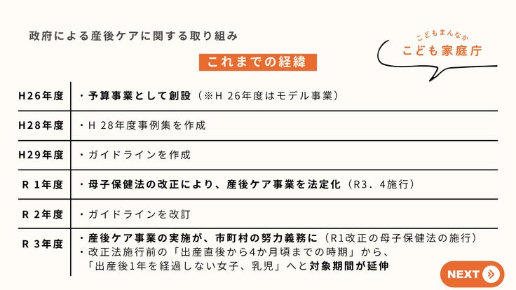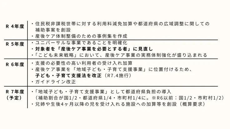 母子保健法の改正により令和元年に産後ケア事業は法定化されました。まだまだ新しい事業ではありますが、年々制度の内容が充実しており、令和5年にはユニバーサルな事業であることが明確化され、産後ケアの対象者も「産後ケアを必要とする者」に見直されました。
