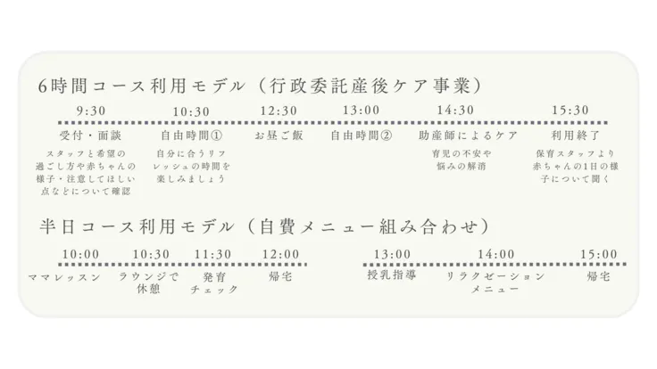 産後ケア事業は通所型(6時間と1時間)の受け入れを行います。