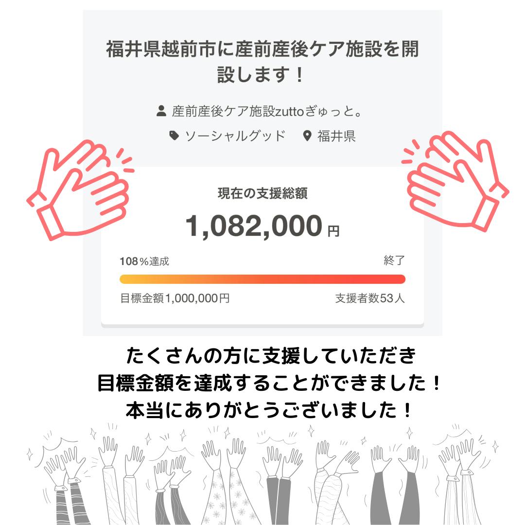 2025/07/13 12:447月6日をもちまして、約3週間に渡るクラウドファンディングを終了させていただきました。私達の想像を遥かに超える多数の温かいご支援をいただき、最終前日には目標金額の100%を突破しました。合計1082000円というご支援をいただきましたこと感謝申し上げます。ご支援いただいた皆様、ご共感いただき応援していただいた皆様、クラウドファンディングのサイトを閲覧してくださった皆様、本当にありがとうございました。今回のクラウドファンディングの目的は、安全な施設を作るための設備費資金を集めることに加え、より多くの人に産後ケア事業について知っていただくことを目標としていました。たくさんの方にサイトを閲覧していただき、応援のご連絡をいただました。今後さらに私たちにできることは何かをしっかり考えながら施設運営に努めていきたいと思います。今回頂いた、予想を遥かに超えるご支援をもとに、産前産後のママにより良いサービスを届けられるよう努めていきます。また、ご支援いただいた皆様のリターンの準備もさせていただいています。順次ご連絡させていただきますので、よろしくお願い致します。7月7日〜7月11日に開催したプレオープンイベントの様子についてもこちらの活動報告でご紹介させていただきたいと思っております。引き続き皆様、よろしくお願いいたします。2025年7月13日 産前産後ケア施設zuttoぎゅっと。(一般社団法人zutto123)代表 藤 凜 もっと見る