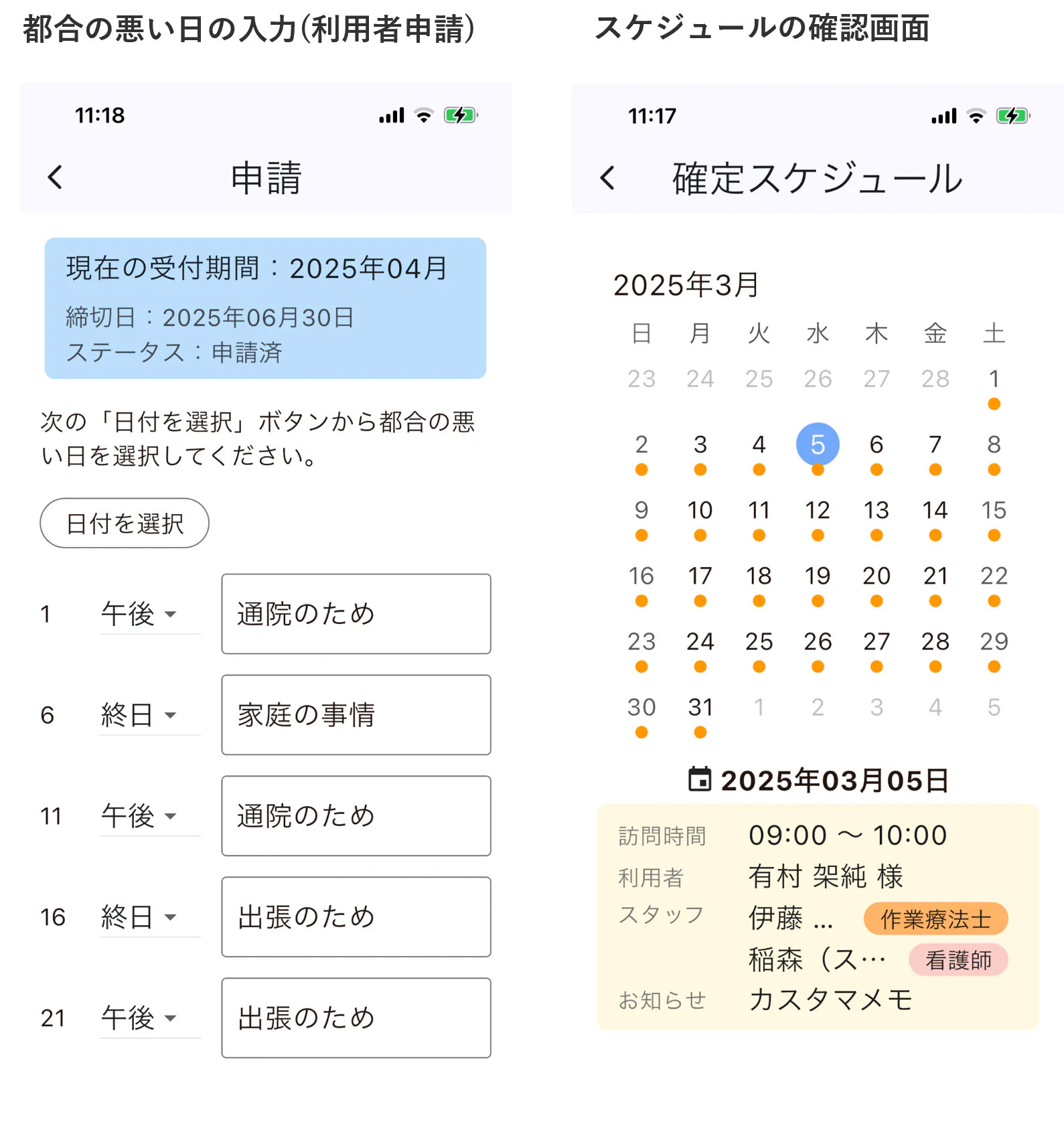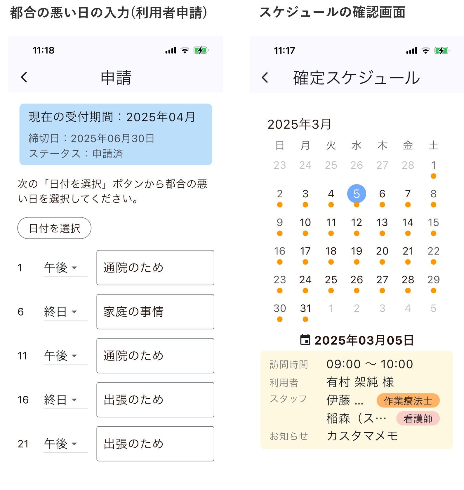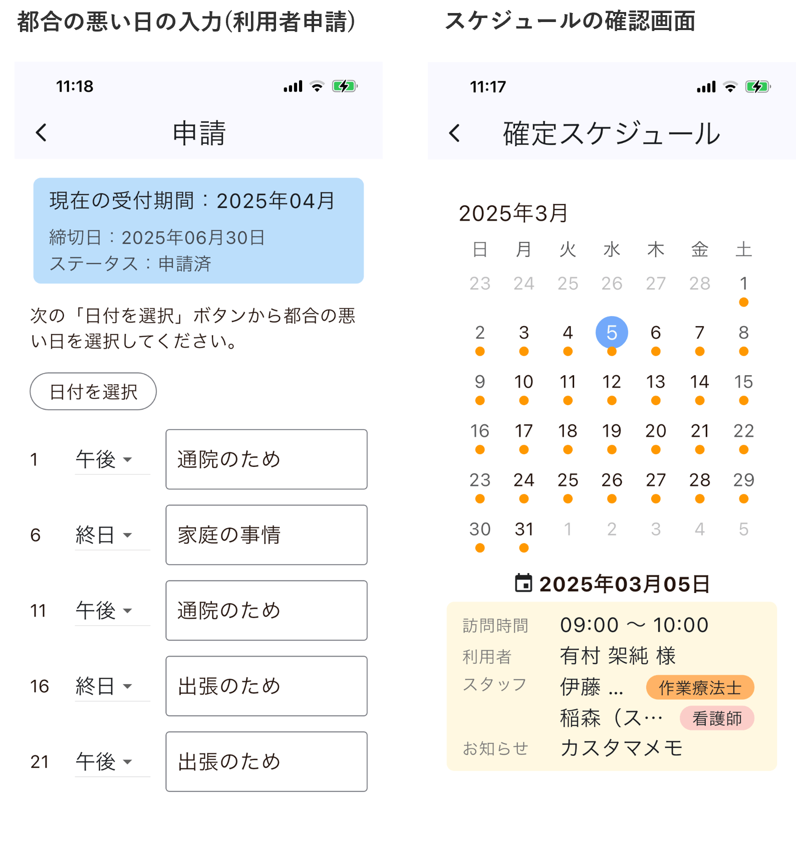 利用者さんと訪問スタッフさんが利用するスマートフォン(Android, iPhone)で都合の悪い日の申請とスケジュールの確認ができ、事業所の管理者様およびスタッフさん向けにはタブレットおよびWEBブラウザで管理ができるようにしました。