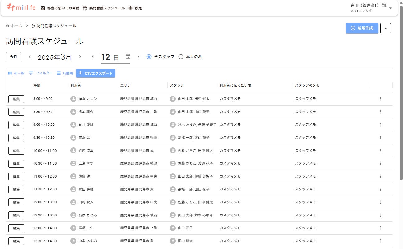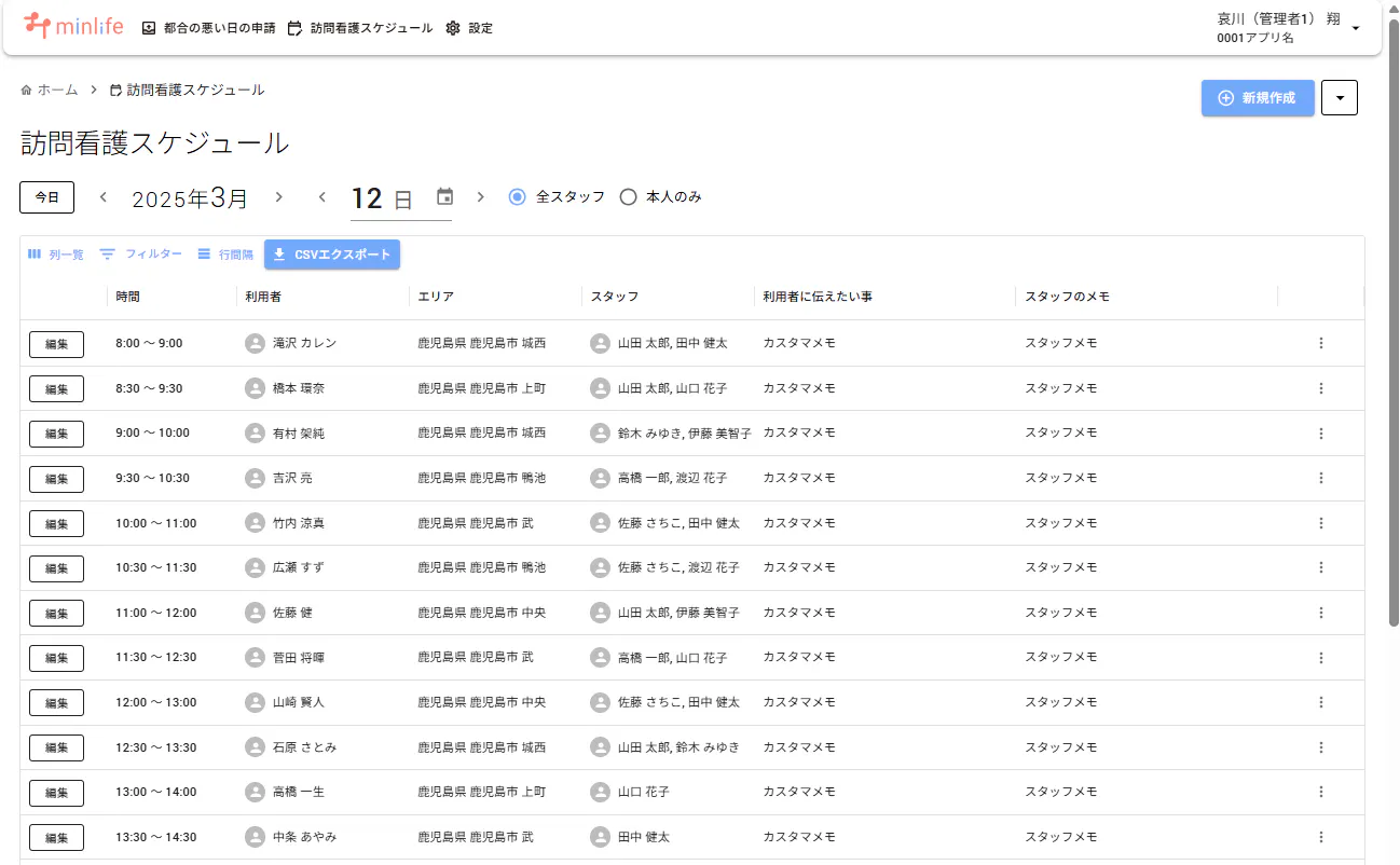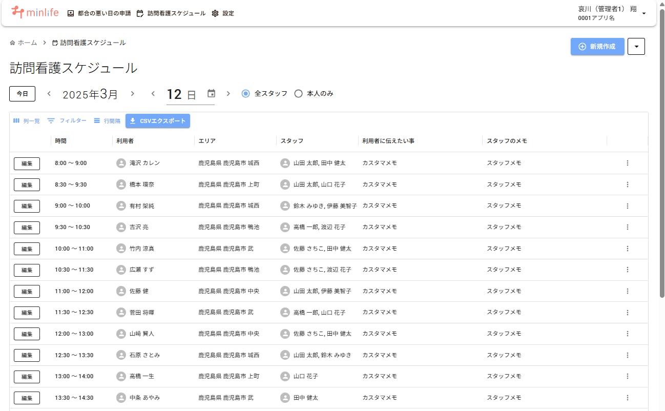 事業所のスタッフや管理者が閲覧・編集可能な訪問スケジュール画面